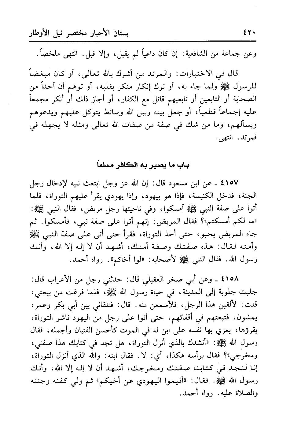4158- وَعَنْ أَبِي صَخْرٍ الْعُقَيْلِيِّ قَالَ: حَدَّثَنِي رَجُلٌ مِنْ الْأَعْرَابِ قَالَ: جَلَبْت جَلُوبَةً إلَى الْمَدِينَةِ فِي حَيَاةِ رَسُولِ اللَّهِ - صلى الله عليه وسلم - فَلَمَّا فَرَغْت مِنْ بَيْعَتِي قُلْت: لَأَلْقَيَنَّ هَذَا الرَّجُلَ وَلَأَسْمَعَنَّ مِنْهُ، قَالَ: فَتَلَقَّانِي بَيْنَ أَبِي بَكْرٍ وَعُمَرَ يَمْشُونَ فَتَبِعْتُهُمْ فِي أَقْفَائِهِمْ حَتَّى أَتَوْا عَلَى رَجُلٍ مِنْ الْيَهُودِ نَاشِرًا التَّوْرَاةَ يَقْرَؤُهَا يُعَزِّي بِهَا نَفْسَهُ عَلَى ابْنٍ لَهُ فِي الْمَوْتِ كَأَحْسَنِ الْفِتْيَانِ وَأَجْمَلِهِ، فَقَالَ رَسُولُ اللَّهِ - صلى الله عليه وسلم -: «أَنْشُدُك بِاَلَّذِي أَنْزَلَ التَّوْرَاةَ هَلْ تَجِدُ فِي كِتَابِك هَذَا صِفَتِي وَمَخْرَجِي» ؟ فَقَالَ بِرَأْسِهِ هَكَذَا: أَيْ لَا، فَقَالَ ابْنُهُ: وَاَللَّهِ الَّذِي أَنْزَلَ التَّوْرَاةَ إنَّا لَنَجِدُ فِي كِتَابِنَا صِفَتَك وَمَخْرَجَك، أَشْهَدُ أَنْ لَا إلَهَ إلَّا اللَّهُ، وَأَنَّك رَسُولُ اللَّهِ، فَقَالَ: «أَقِيمُوا الْيَهُودِيَّ عَنْ أَخِيكُمْ» . ثُمَّ وَلِيَ دَفْنَهُ وَجَنَنَهُ وَالصَّلَاةَ عَلَيْهِ. رَوَاهُ أَحْمَدُ.