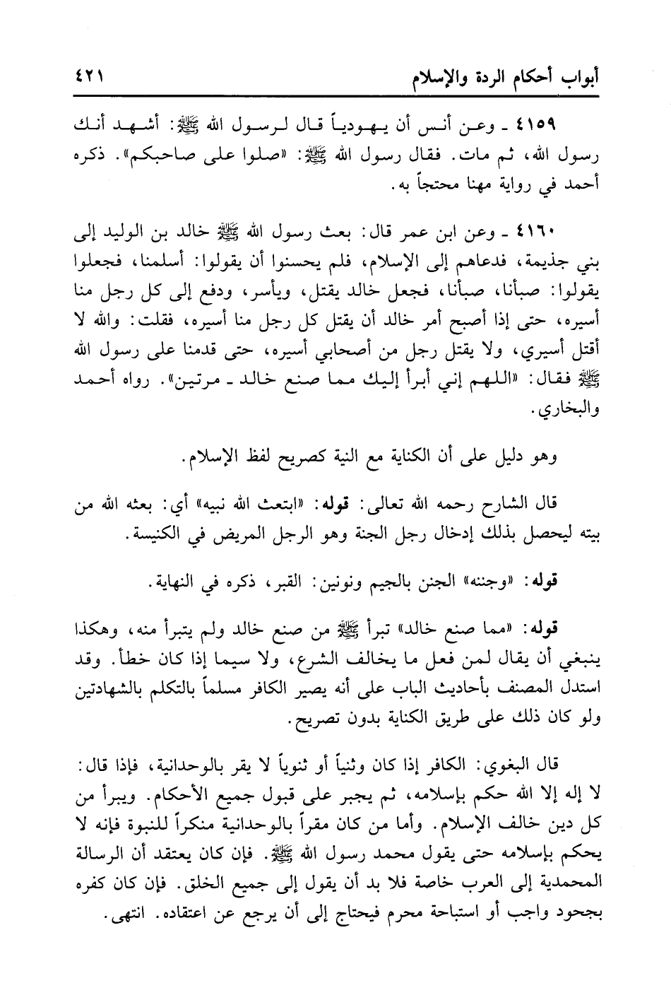 قَوْلُهُ: «مِمَّا صَنَعَ خَالِدٌ» تَبَرَّأَ - صلى الله عليه وسلم - مِنْ صُنْعِ خَالِدٍ وَلَمْ يَتَبَرَّأْ مِنْهُ، وَهَكَذَا يَنْبَغِي أَنْ يُقَالَ لِمَنْ فَعَلَ مَا يُخَالِفُ الشَّرْعَ وَلاسِيَّمَا إذَا كَانَ خَطَأً. وَقَدْ اسْتَدَلَّ الْمُصَنِّفُ بِأَحَادِيثِ الْبَابِ عَلَى أَنَّهُ يَصِيرُ الْكَافِرُ مُسْلِمًا بِالتَّكَلُّمِ بِالشَّهَادَتَيْنِ وَلَوْ كَانَ ذَلِكَ عَلَى طَرِيقِ الْكِنَايَةِ بِدُونِ تَصْرِيحٍ.