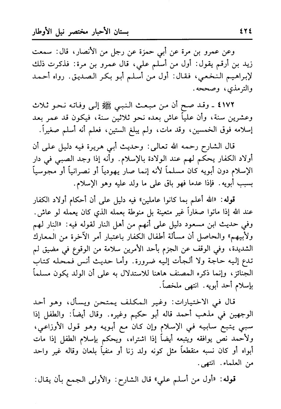 قَالَ الشَّارِحُ رَحِمَهُ اللهُ تَعَالَى: وَحَدِيثُ أَبِي هُرَيْرَةَ فِيهِ دَلِيلٌ عَلَى أَنَّ أَوْلَادَ الْكُفَّارِ يُحْكَمُ لَهُمْ عِنْدَ الْوِلَادَةِ بِالْإِسْلَامِ، وَأَنَّهُ إذَا وُجِدَ الصَّبِيُّ فِي دَارِ الْإِسْلَامِ دُونَ أَبَوَيْهِ كَانَ مُسْلِمًا، لِأَنَّهُ إنَّمَا صَارَ يَهُودِيًّا أَوْ نَصْرَانِيًّا أَوْ مَجُوسِيًّا بِسَبَبِ أَبَوَيْهِ، فَإِذَا عَدِمَا فَهُوَ بَاقٍ عَلَى مَا وُلِدَ عَلَيْهِ وَهُوَ الْإِسْلَامُ.