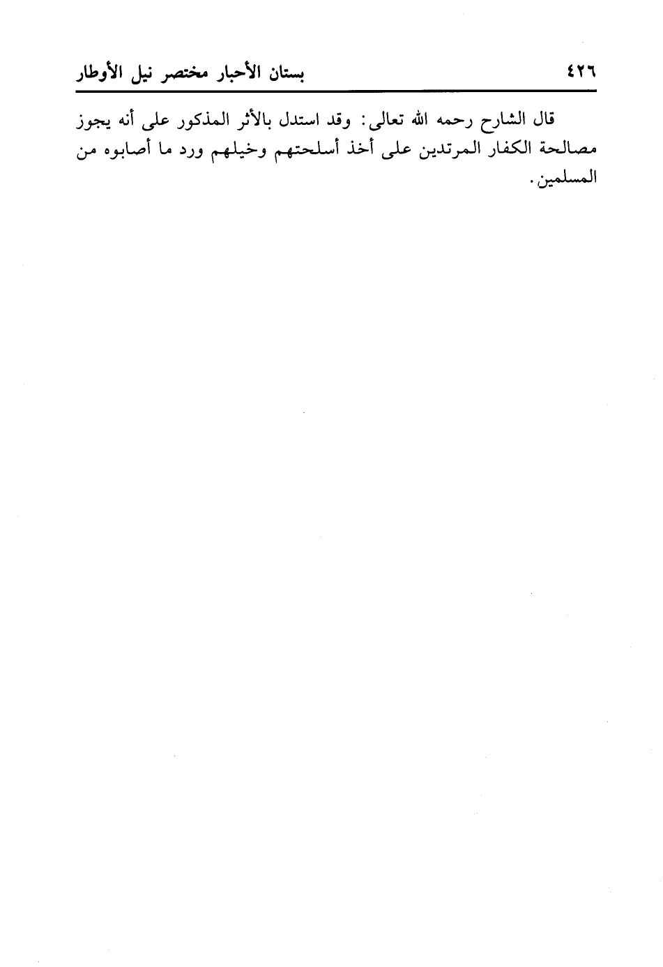 قَالَ الشَّارِحُ رَحِمَهُ اللهُ تَعَالَى: وَقَدْ اُسْتُدِلَّ بِالْأَثَرِ الْمَذْكُورِ عَلَى أَنَّهُ يَجُوزُ مُصَالَحَةُ الْكُفَّارِ الْمُرْتَدِّينَ عَلَى أَخْذِ أَسْلِحَتِهِمْ وَخَيْلِهِمْ، وَرَدِّ مَا أَصَابُوهُ مِنْ الْمُسْلِمِينَ.