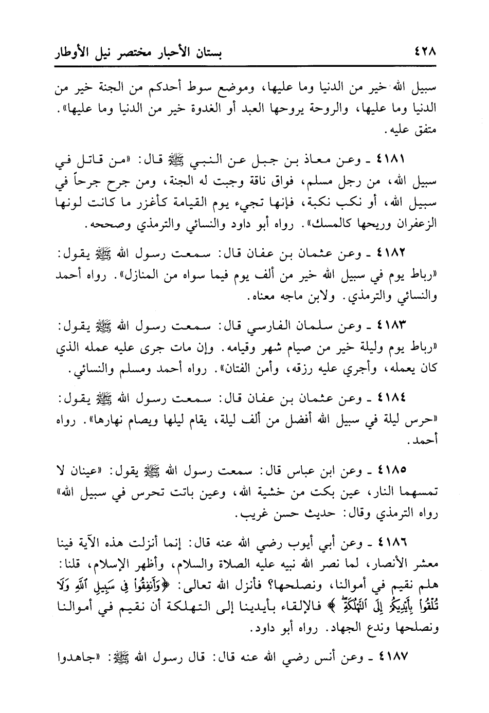 4184- وَعَنْ عُثْمَانَ بْنِ عَفَّانَ قَالَ: سَمِعْت رَسُولَ اللهِ - صلى الله عليه وسلم - يَقُولُ: ... «حَرْسُ لَيْلَةٍ فِي سَبِيلِ اللهِ أَفْضَلُ مِنْ أَلْفِ لَيْلَةٍ يُقَامِ لَيْلِهَا وَيُصَامِ نَهَارِهَا» . رَوَاهُ أَحْمَدُ.