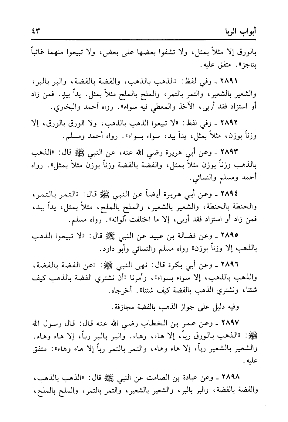 2891- وَفِي لَفْظٍ: «الذَّهَبُ بِالذَّهَبِ، وَالْفِضَّةُ بِالْفِضَّةِ، وَالْبُرُّ بِالْبُرِّ، وَالشَّعِيرُ بِالشَّعِيرِ، وَالتَّمْرُ بِالتَّمْرِ، وَالْمِلْحُ بِالْمِلْحِ، مِثْلًا بِمِثْلٍ يَدًا بِيَدٍ، فَمَنْ زَادَ أَوْ اسْتَزَادَ فَقَدْ أَرْبَى، الآخِذُ وَالْمُعْطِي فِيهِ سَوَاءٌ» . رَوَاهُ أَحْمَدُ وَالْبُخَارِيُّ.
