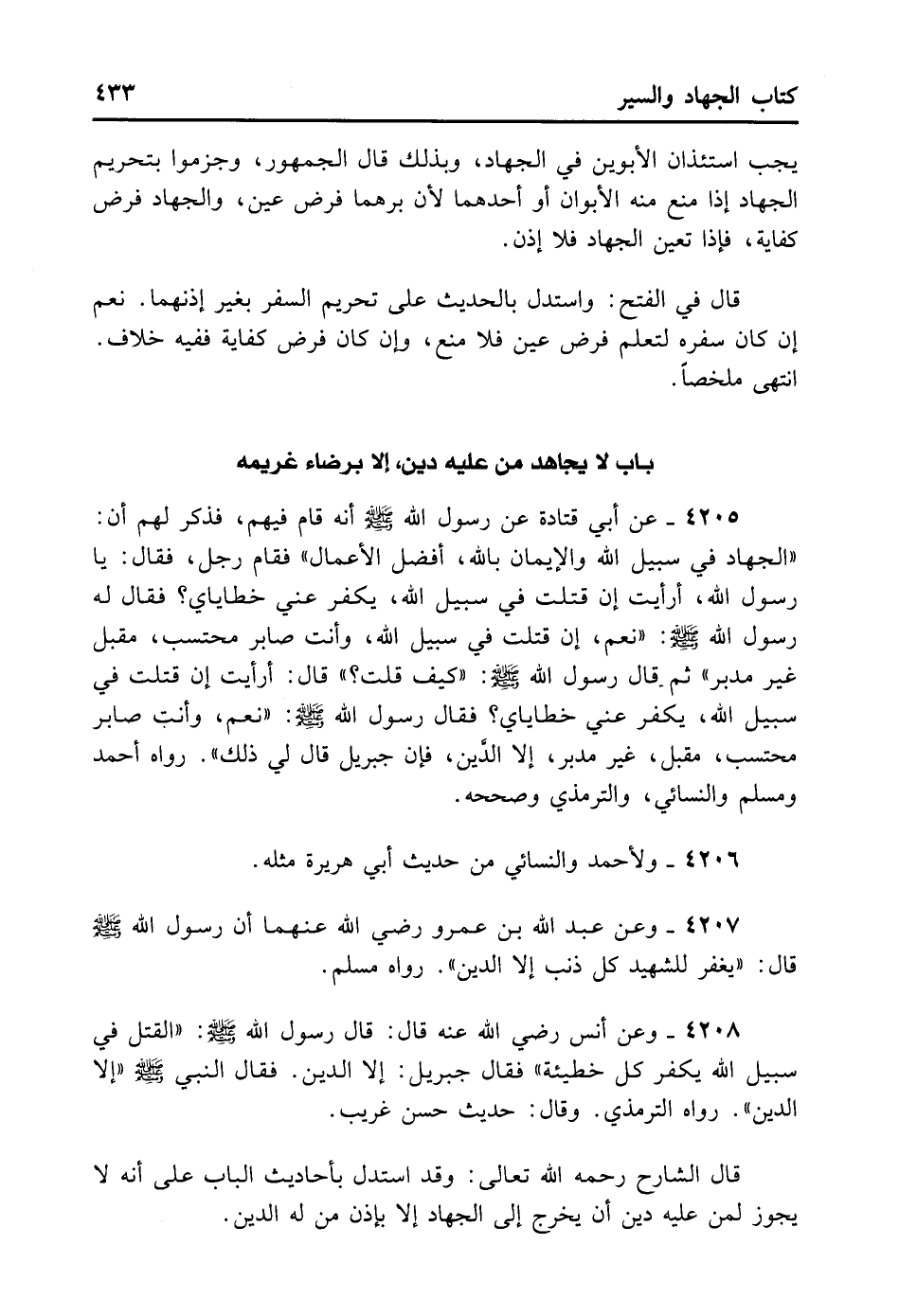 قَالَ الشَّارِحُ رَحِمَهُ اللهُ تَعَالَى: وَقَدْ اُسْتُدِلَّ بِأَحَادِيثِ الْبَاب عَلَى أَنَّهُ لا يَجُوزُ لِمَنْ عَلَيْهِ دَيْنٌ أَنْ يَخْرُجَ إلَى الْجِهَادِ إِلا بِإِذْنِ مَنْ لَهُ الدَّيْنُ.