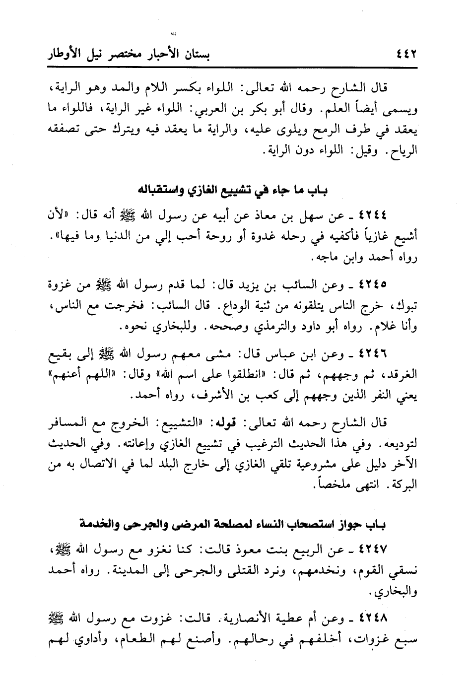 4247- عَنْ الرُّبَيِّعِ بِنْتِ مُعَوِّذٍ قَالَتْ: كُنَّا نَغْزُو مَعَ رَسُولِ اللهِ - صلى الله عليه وسلم - نَسْقِي الْقَوْمَ وَنَخْدُمُهُمْ وَنَرُدُّ الْقَتْلَى وَالْجَرْحَى إلَى الْمَدِينَةِ. رَوَاهُ أَحْمَدُ وَالْبُخَارِيُّ.