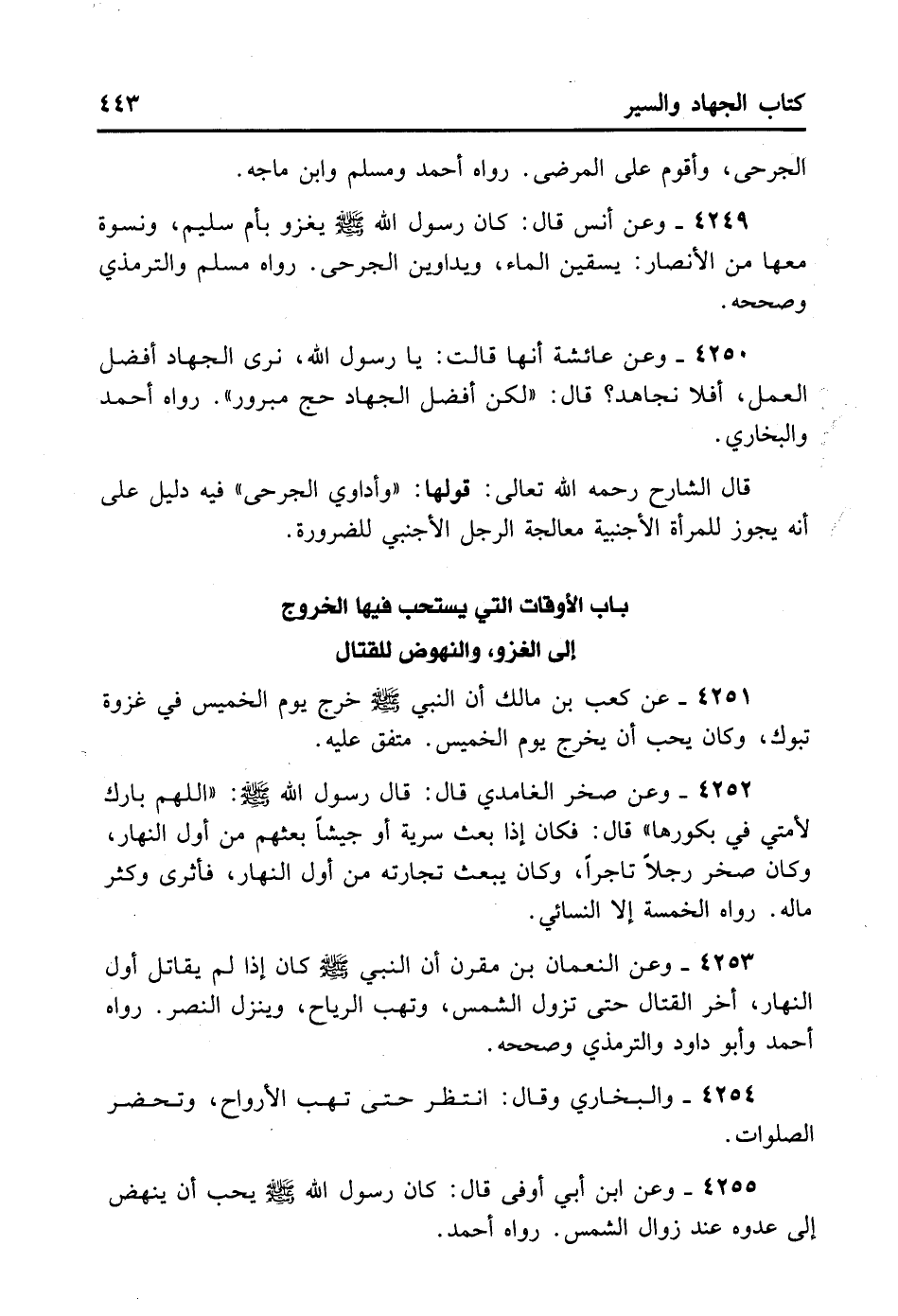 4253- وَعَنْ النُّعْمَانِ بْنِ مُقَرِّنٍ أَنَّ النَّبِيَّ - صلى الله عليه وسلم - كَانَ إذَا لَمْ يُقَاتِلْ أَوَّلَ النَّهَارِ أَخَّرَ الْقِتَالَ حَتَّى تَزُولَ الشَّمْسُ وَتَهُبَّ الرِّيَاحُ وَيَنْزِلَ النَّصْرُ. رَوَاهُ أَحْمَدُ وَأَبُو دَاوُد وَالتِّرْمذي وَصَحَّحَهُ.
