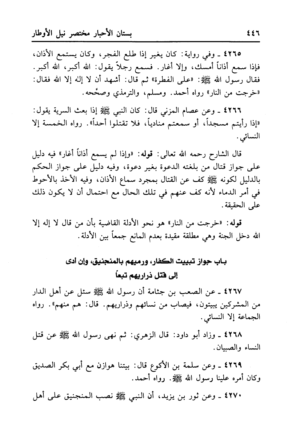 قَالَ الشَّارِحُ رَحِمَهُ اللهُ تَعَالَى: قَوْلُهُ: (وَإِذَا لَمْ يَسْمَعْ أَذَانًا أَغَارَ) فِيهِ دَلِيلٌ عَلَى جَوَازِ قِتَالِ مَنْ بَلَغَتْهُ الدَّعْوَةُ بِغَيْرِ دَعْوَةٍ وَفِيهِ دَلِيلٌ عَلَى جَوَازِ الْحُكْمِ بِالدَّلِيلِ لِكَوْنِهِ - صلى الله عليه وسلم - كَفَّ عَنْ الْقِتَالِ بِمُجَرَّدِ سَمَاعِ الأذَانِ. وَفِيهِ الأخْذُ بِالأحْوَطِ فِي أَمْرِ الدِّمَاءِ لأنَّهُ كَفَّ عَنْهُمْ فِي تِلْكَ الْحَالِ مَعَ احْتِمَالِ أَنْ لا يَكُونَ ذَلِكَ عَلَى الْحَقِيقَةِ.