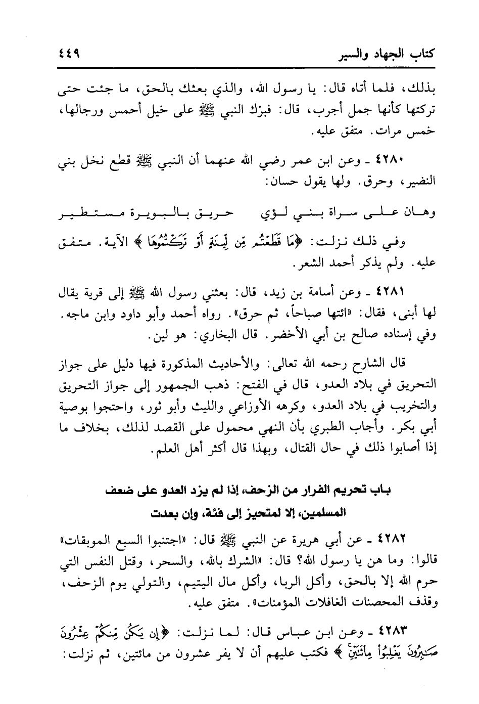 4280- وَعَنْ ابْنِ عُمَرَ رَضِيَ اللهُ عَنْهُمَا أَنَّ النَّبِيَّ - صلى الله عليه وسلم - قَطَعَ نَخْلَ بَنِي النَّضِيرِ وَحَرَّقَ. وَلَهَا يَقُولُ حَسَّانٌ: