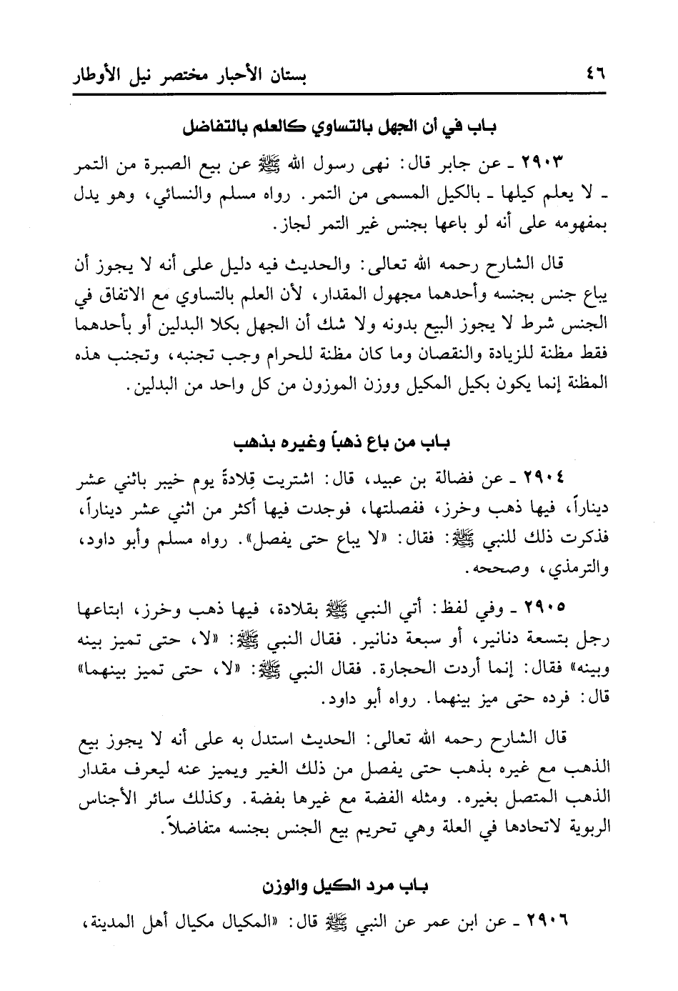 2903- عَنْ جَابِرٍ قَالَ: نَهَى رَسُولُ اللَّهِ - صلى الله عليه وسلم - عَنْ بَيْعِ الصُّبْرَةِ مِنْ التَّمْرِ لا يُعْلَمُ كَيْلُهَا بِالْكَيْلِ الْمُسَمَّى مِنْ التَّمْرِ. رَوَاهُ مُسْلِمٌ وَالنَّسَائِيُّ وَهُوَ يَدُلُّ بِمَفْهُومِهِ عَلَى أَنَّهُ لَوْ بَاعَهَا بِجِنْسٍ غَيْرِ التَّمْرِ لَجَازَ.