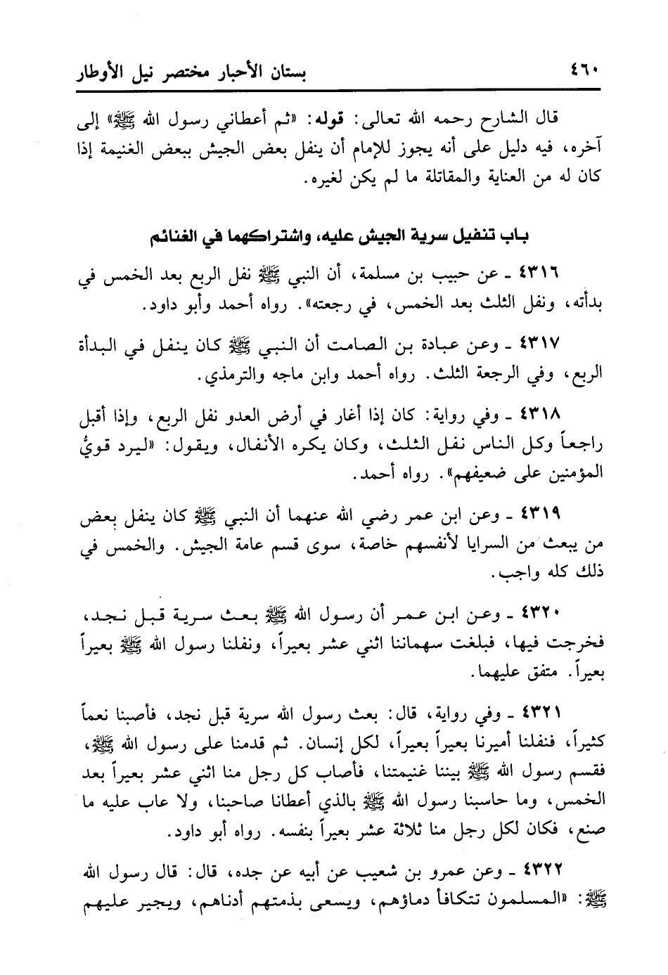 4319- وَعَنْ ابْنِ عُمَرَ رَضِيَ اللهُ عَنْهُمَا أَنَّ النَّبِيَّ - صلى الله عليه وسلم - كَانَ يُنَفِّلُ بَعْضَ مَنْ يَبْعَثُ مِنْ السَّرَايَا لأنْفُسِهِمْ خَاصَّةً سِوَى قَسْمِ عَامَّةِ الْجَيْشِ وَالْخُمُسُ فِي ذَلِكَ كُلُّهُ وَاجِبٌ.