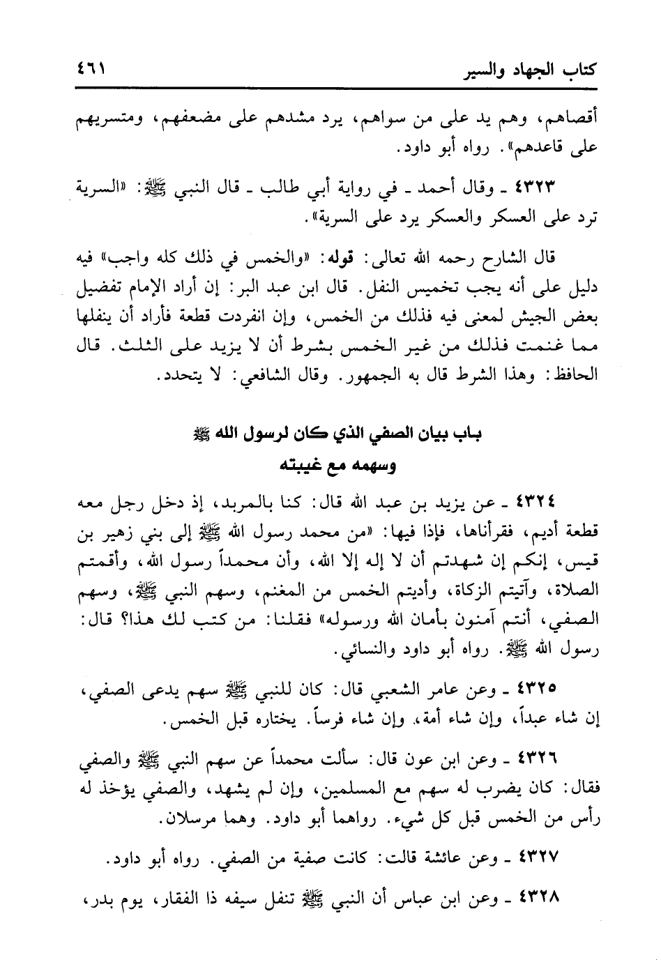 4326- وَعَنْ ابْنِ عَوْنٍ قَالَ: سَأَلْت مُحَمَّدًا عَنْ سَهْمِ النَّبِيِّ - صلى الله عليه وسلم - وَالصَّفِيِّ فَقَالَ: كَانَ يُضْرَبُ لَهُ سَهْمٌ مَعَ الْمُسْلِمِينَ، وَإِنْ لَمْ يَشْهَدْ، وَالصَّفِيُّ يُؤْخَذُ لَهُ رَأْسٌ مِنْ الْخُمُسِ، قَبْلَ كُلِّ شَيْءٍ. رَوَاهُمَا أَبُو دَاوُد وَهُمَا مُرْسَلانِ.