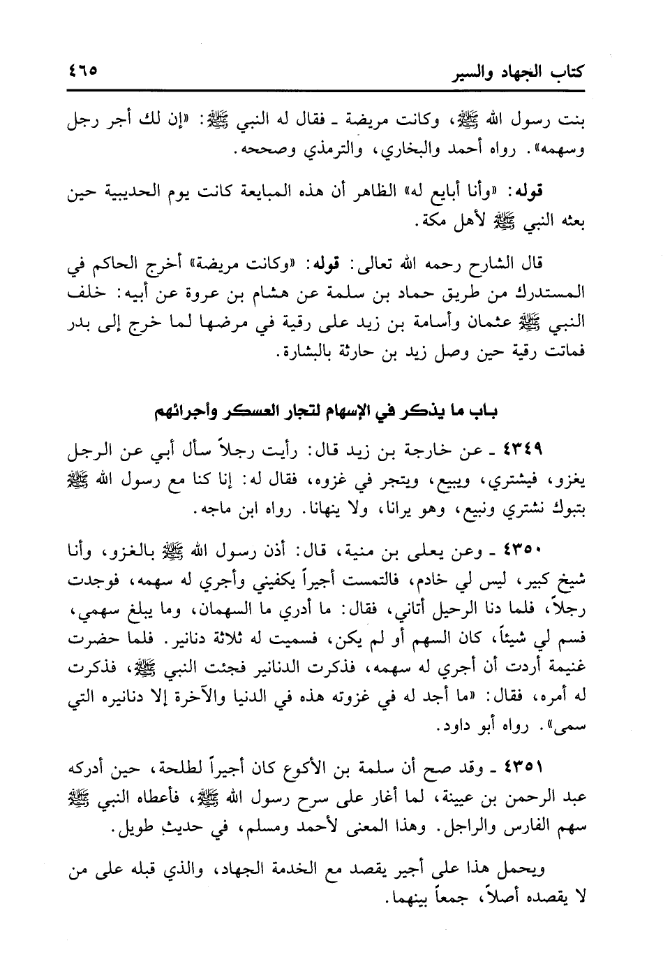 4351- وَقَدْ صَحَّ أَنَّ سَلَمَةَ بْنَ الأكْوَعِ كَانَ أَجِيرًا لِطَلْحَةَ حِينَ أَدْرَكَه عَبْدَ الرَّحْمَنِ بْنَ عُيَيْنَةَ لَمَّا أَغَارَ عَلَى سَرْحِ رَسُولِ اللهِ - صلى الله عليه وسلم - فَأَعْطَاهُ النَّبِيُّ - صلى الله عليه وسلم - سَهْمَ الْفَارِسِ وَالرَّاجِلِ، وَهَذَا الْمَعْنَى لأحْمَدَ وَمُسْلِمٍ فِي حَدِيثٍ طَوِيلٍ.
