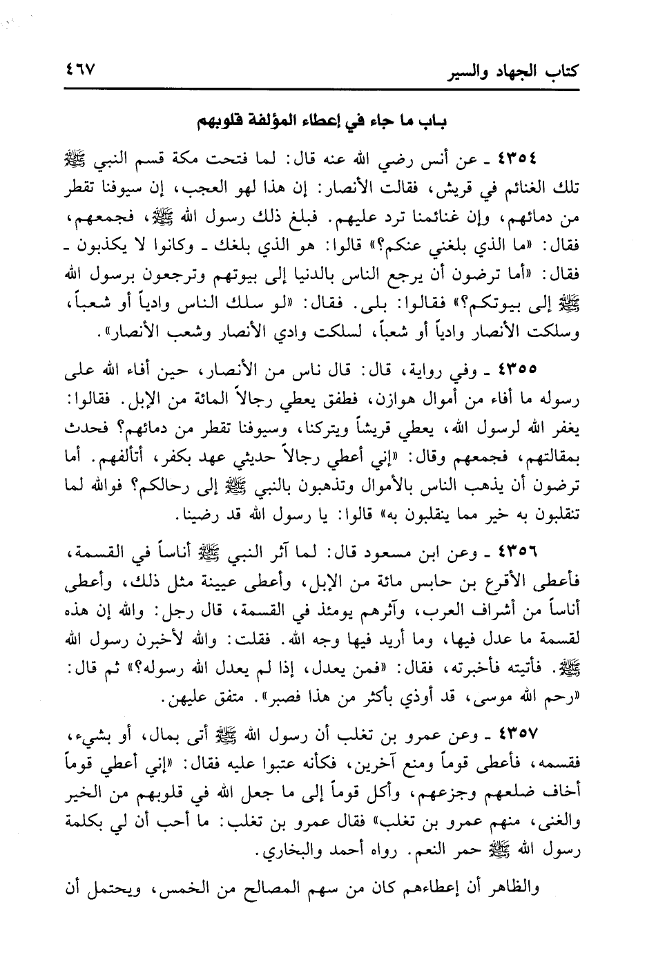 4357- وَعَنْ عَمْرِو بْنِ تَغْلِبَ أَنَّ رَسُولَ اللهِ - صلى الله عليه وسلم - أُتِيَ بِمَالٍ أَوْ بِسَبْيٍ فَقَسَمَهُ، فَأَعْطَى قَوْمًا وَمَنَعَ آخَرِينَ، فَكَأَنَّهُمْ عَتَبُوا عَلَيْهِ، فَقَالَ: «إنِّي أُعْطِي قَوْمًا أَخَافُ ضَلَعَهُمْ وَجَزَعَهُمْ، وَأَكِلُ قَوْمًا إلَى مَا جَعَلَ اللهُ فِي قُلُوبِهِمْ مِنْ الْخَيْرِ وَالْغِنَى مِنْهُمْ عَمْرُو بْنُ تَغْلِبَ» . فَقَالَ عَمْرُو بْنُ تَغْلِبَ: مَا أُحِبُّ أَنَّ لِي بِكَلِمَةِ رَسُولِ اللهِ - صلى الله عليه وسلم - حُمْرَ النَّعَمِ. رَوَاهُ أَحْمَدُ وَالْبُخَارِيُّ.