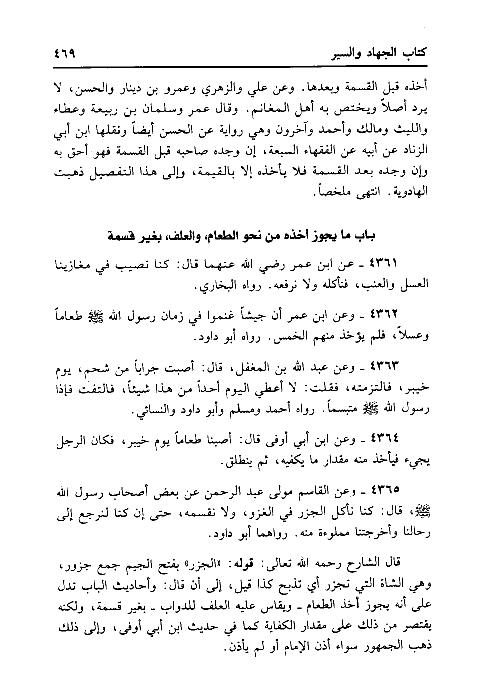 4364- وَعَنْ ابْنِ أَبِي أَوْفَى قَالَ: أَصَبْنَا طَعَامًا يَوْمَ خَيْبَرَ، وَكَانَ الرَّجُلُ يَجِيءُ فَيَأْخُذُ مِنْهُ مِقْدَارَ مَا يَكْفِيهِ ثُمَّ يَنْطَلِقُ.