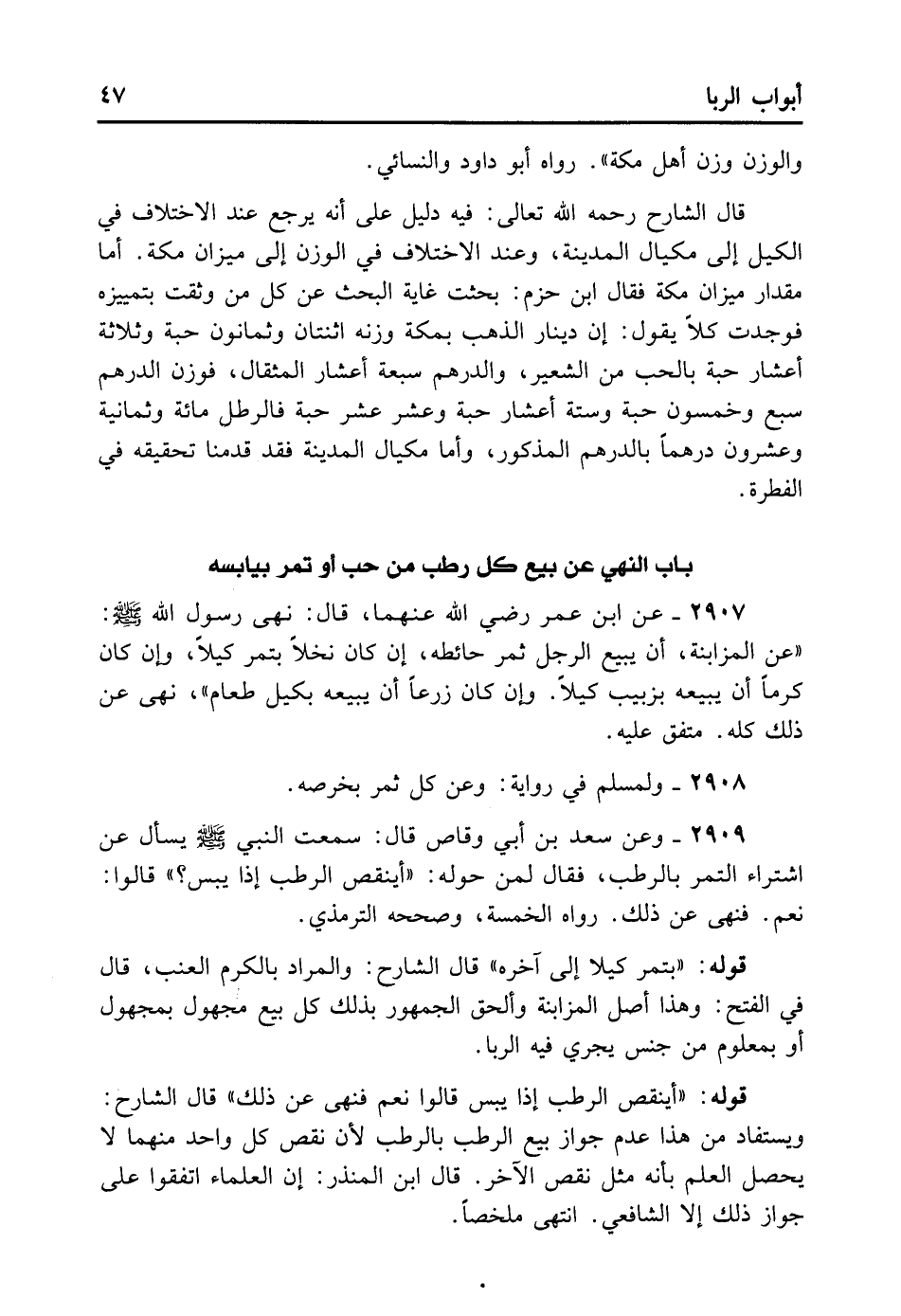 قَالَ الشَّارِحُ رَحِمَهُ اللهُ تَعَالَى: فِيهِ دَلِيلٌ عَلَى أَنَّهُ يُرْجَعُ عِنْدَ الاخْتِلافِ فِي الْكَيْلِ إلَى مِكْيَالِ الْمَدِينَةِ وَعِنْدَ الاخْتِلافِ فِي الْوَزْنِ إلَى مِيزَانِ مَكَّةَ. أَمَّا مِقْدَارُ مِيزَانِ مَكَّةَ فَقَالَ ابْنُ حَزْمٍ: بَحَثْتُ غَايَةَ الْبَحْثِ عَنْ كُلِّ مَنْ وَثَقْتُ بِتَمْيِيزِهِ فَوَجَدْتُ كُلًّا يَقُولُ: إنَّ دِينَارَ الذَّهَبِ بِمَكَّةَ وَزْنُهُ اثْنَتَانِ وَثَمَانُونَ حَبَّةً وَثَلاثَةُ أَعْشَارِ حَبَّةٍ بِالْحَبِّ مِنْ الشَّعِيرِ، وَالدِّرْهَمُ سَبْعَةُ أَعْشَارِ الْمِثْقَالِ، فَوَزْنُ الدِّرْهَمِ