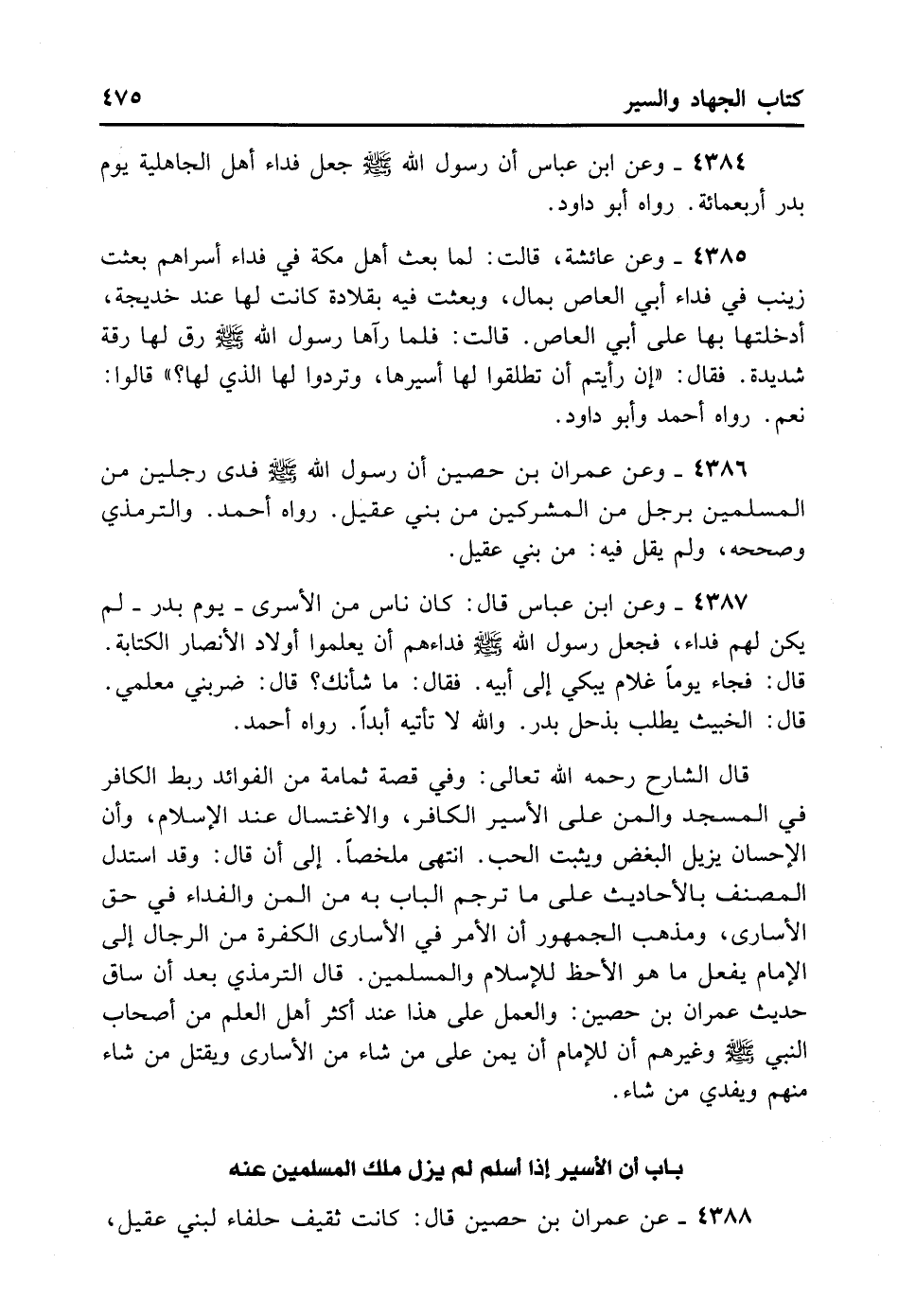 4386- وَعَنْ عِمْرَانَ بْنِ حُصَيْنٍ: أَنَّ رَسُولَ اللهِ - صلى الله عليه وسلم - فَدَى رَجُلَيْنِ مِنْ الْمُسْلِمِينَ بِرَجُلٍ مِنْ الْمُشْرِكِينَ مِنْ بَنِي عُقَيْلٍ. رَوَاهُ أَحْمَدُ وَالتِّرْمِذِيُّ وَصَحَّحَهُ، وَلَمْ يَقُلْ فِيهِ: مِنْ بَنِي عُقَيْلٍ.