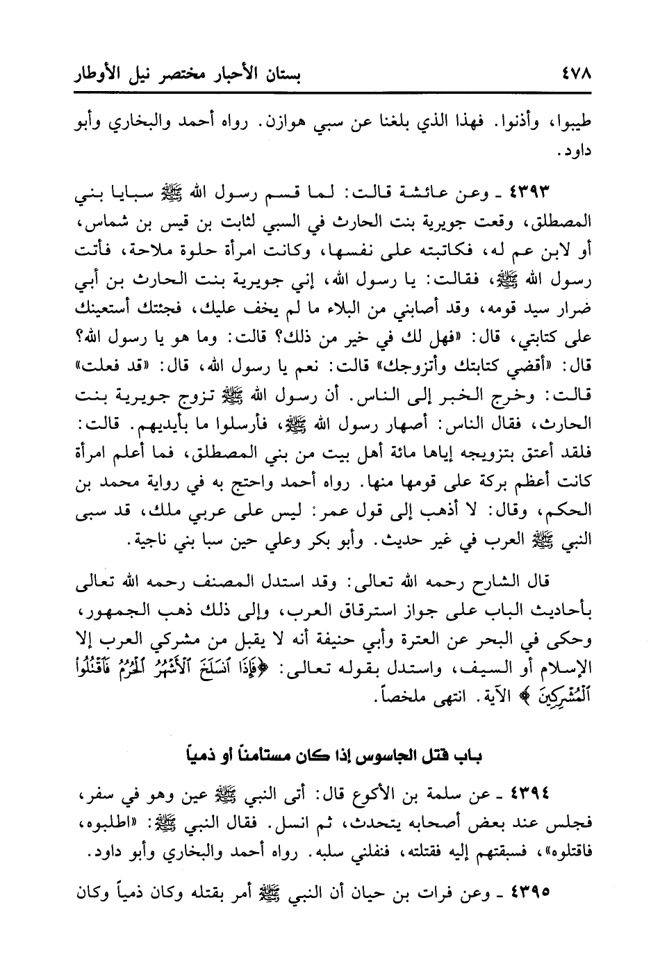 4393- وَعَنْ عَائِشَةَ قَالَتْ: لَمَّا قَسَمَ رَسُولُ اللهِ - صلى الله عليه وسلم - سَبَايَا بَنِي الْمُصْطَلِقِ وَقَعَتْ جَوَيْرِيَةَ بِنْتُ الْحَارِثِ فِي السَّبْيِ لِثَابِتِ بْنِ قَيْسِ بْنِ شَمَّاسٍ أَوْ لِابْنِ عَمٍّ لَهُ، فَكَاتَبَتْهُ عَلَى نَفْسِهَا وَكَانَتْ امْرَأَةً حُلْوَةً مُلَّاحَةً، فَأَتَتْ رَسُولَ اللهِ - صلى الله عليه وسلم - فَقَالَتْ: يَا رَسُولَ اللهِ إنِّي جَوَيْرِيَةَ بِنْتُ الْحَارِثِ بْنِ أَبِي ضِرَارٍ سَيِّدِ قَوْمِهِ وَقَدْ أَصَابَنِي مِنْ الْبَلاءِ مَا لَمْ يَخْفَ عَلَيْكَ، فَجِئْتُك أَسْتَعِينُكَ عَلَى كِتَابَتِي، قَالَ: «فَهَلْ لَكِ فِي خَيْرٍ مِنْ ذَلِكَ» ؟ قَالَتْ: وَمَا هُوَ يَا رَسُولَ اللهِ؟ قَالَ: «أَقْضِي كِتَابَتَكِ وَأَتَزَوَّجُكَ» . قَالَتْ: نَعَمْ يَا رَسُولَ اللهِ، قَالَ: «قَدْ فَعَلْتُ» . قَالَتْ: وَخَرَجَ الْخَبَرُ إلَى النَّاسِ أَنَّ رَسُولَ اللهِ - صلى الله عليه وسلم - تَزَوَّجَ جَوَيْرِيَةَ بِنْتَ الْحَارِثِ، فَقَالَ النَّاسُ أَصْهَارُ رَسُولِ اللهِ - صلى الله عليه وسلم - فَأَرْسَلُوا مَا بِأَيْدِيهِمْ، قَالَتْ: فَلَقَدْ أَعْتَقَ بِتَزْوِيجِهِ إيَّاهَا مِائَةَ أَهْلِ بَيْتٍ مِنْ بَنِي الْمُصْطَلِقِ، فَمَا أَعْلَمُ امْرَأَةً كَانَتْ أَعْظَمَ بَرَكَةً عَلَى قَوْمِهَا مِنْهَا. رَوَاهُ أَحْمَدُ، وَاحْتَجَّ بِهِ فِي رِوَايَةِ مُحَمَّدِ بْنِ الْحَكَمِ وَقَالَ: لا أَذْهَبُ إلَى قَوْلِ عُمَرَ: لَيْسَ عَلَى عَرَبِيٍّ مِلْكٌ، قَدْ سَبَى النَّبِيُّ - صلى الله عليه وسلم - الْعَرَبَ فِي غَيْرِ حَدِيثٍ وَأَبُو بَكْرٍ وَعَلِيٌّ حِينَ سَبَى بَنِي نَاجِيَةَ.