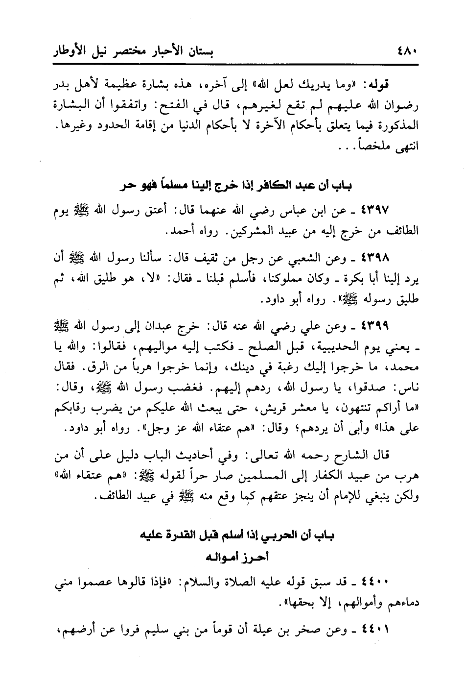 قَالَ الشَّارِحُ رَحِمَهُ اللهُ تَعَالَى: وَفِي أَحَادِيثِ الْبَابِ دَلِيلٌ عَلَى أَنَّ مَنْ هَرَبَ مِنْ عَبِيدِ الْكُفَّارِ إلَى الْمُسْلِمِينَ صَارَ حُرًّا لِقَوْلِهِ - صلى الله عليه وسلم -: «هُمْ عُتَقَاءُ اللهِ» وَلَكِنْ يَنْبَغِي لِلإِمَامِ أَنْ يُنَجِّزَ عِتْقَهُمْ كَمَا وَقَعَ مِنْهُ - صلى الله عليه وسلم - فِي عَبِيدِ الطَّائِفِ.