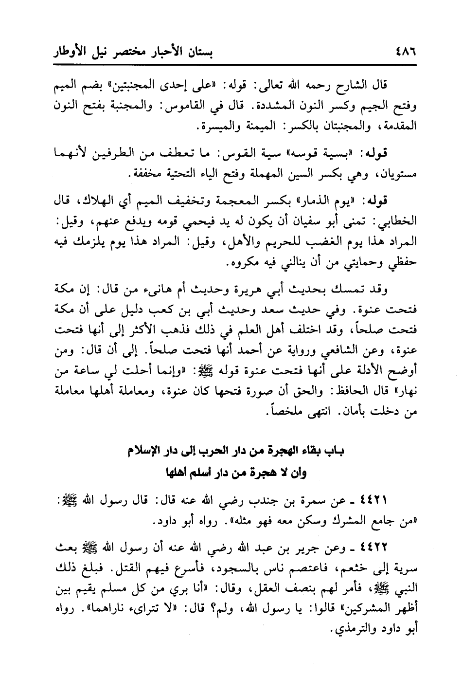 وَقَدْ تَمَسَّكَ بِحَدِيثِ أَبِي هُرَيْرَة وَحَدِيث أُمُّ هَانِئ مَنْ قَالَ: إِنَّ مَكَّةَ فتحت عَنْوَة. وَفِي حَدِيثِ سَعْد وَحَدِيث أُبَي بن كَعْب عَلَى أَنَّ مَكَّة فُتِحَتْ صلْحًا. وَقَدْ اختلف أَهْلِ الْعِلْم فِي ذَلِك فَذَهَبَ الأكْثَر إِلَى أَنَّهَا فتحت عُنْوة. وَعَنْ الشَّافِعي وَرِوَايَة أَحْمَد أَنَّهَا فُتِحَتْ عُنْوة قَوْلهُ - صلى الله عليه وسلم -: «وَإِنَّمَا أُحِلَّتْ لِي سَاعةٌ مِنْ نَهَار» . قَالَ الْحَافِظْ: وَالْحَقَّ أَنَّ صُورَة فتحها كان عُنْوَةْ وَمُعَامَلة أَهْلِهَا مُعَامَلة مَنْ دَخَلَتْ بِأَمَانْ. انْتَهَى مُلَخَّصًا.