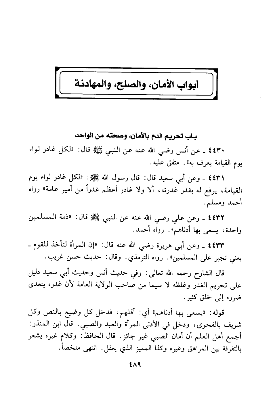 4430- عَنْ أَنَسٍ - رضي الله عنه - عَنْ النَّبِيِّ - صلى الله عليه وسلم - قَالَ: «لَكُلِّ غَادِرٍ لِوَاءٌ يَوْمَ الْقِيَامَةِ يُعْرَفُ بِهِ» . مُتَّفَقٌ عَلَيْهِ.