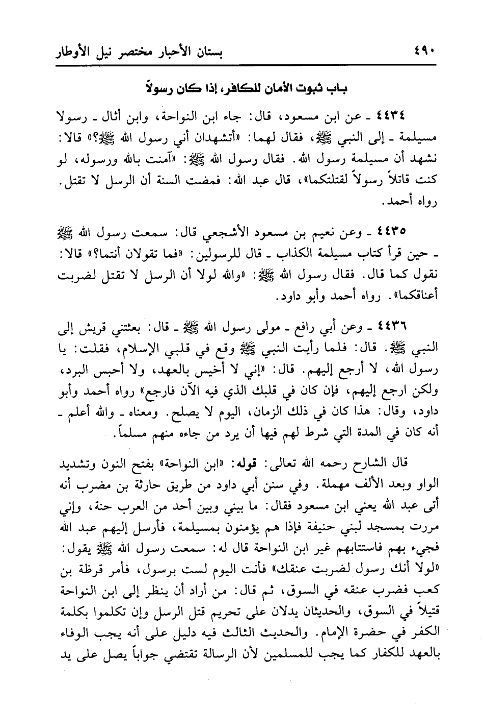 4434- عَنْ ابْنِ مَسْعُودٍ قَالَ: جَاءَ ابْنُ النَّوَّاحَةِ وَابْنُ أُثَالٍ - رَسُولا مُسَيْلِمَةَ - إلَى النَّبِيِّ - صلى الله عليه وسلم - فَقَالَ لَهُمَا: «أَتَشْهَدَانِ أَنِّي رَسُولُ اللهِ» ؟ قَالا: نَشْهَدُ أَنَّ مُسَيْلِمَةَ رَسُولُ اللهِ، فَقَالَ رَسُولُ اللهِ - صلى الله عليه وسلم -: «آمَنْتُ بِاَللَّهِ وَرَسُولِهِ، لَوْ كُنْتُ قَاتِلًا رَسُولًا لَقَتَلْتُكُمَا» . قَالَ عَبْدُ اللهِ: فَمَضَتْ السُّنَّةُ أَنَّ الرُّسُلَ لا تُقْتَلُ. رَوَاهُ أَحْمَدُ.