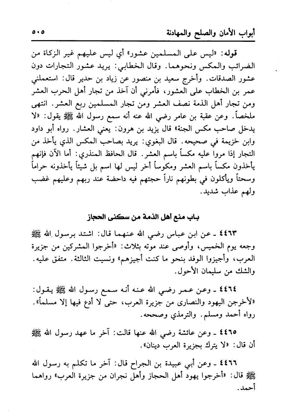 قَوْلُهُ: «وَلَيْسَ عَلَى الْمُسْلِمِينَ عُشُورٌ» أَيْ لَيْسَ عَلَيْهِمْ غَيْرُ الزَّكَاةِ مِنْ الضَّرَائِبِ. وَالْمَكْسِ وَنَحْوهِمَا. وَقَالَ الْخَطَّابِيِّ: يُرِيدُ عُشُورَ التِّجَارَاتِ دُونَ عُشُورِ الصَّدَقَاتِ. وَأَخْرَجَ سَعِيدُ بْنُ مَنْصُورٍ عَنْ زِيَادِ بْنِ حُدَيْرٍ قَالَ: اسْتَعْمَلَنِي عُمَرُ بْنُ الْخَطَّابِ عَلَى الْعُشُورِ فَأَمَرَنِي أَنْ آخُذَ مِنْ تُجَّارِ أَهْلِ الْحَرْبِ الْعُشْرَ، وَمِنْ تُجَّارِ أَهْلِ الذِّمَّةِ نِصْفَ الْعُشْرِ، وَمِنْ تُجَّارِ الْمُسْلِمِينَ رُبْعَ الْعُشْرِ. انْتَهَى مُلَخَّصًا. وعن عقبة بن عامر - رضي الله عنه - أنه سَمِعَ رَسُولَ اللهِ - صلى الله عليه وسلم - يَقُولُ: «لا يدخل صاحب مكس الجنة» . قال يزيد بن هرون: يعني العشار. رواه أَبُو دَاوُد وابن خزيمة في صحيحه. قال البغوي: يريد بصاحب المكس الذي يأخذ من التجار إذا مروا عليه مكسًا باسم العشر: قال الحافظ الْمُنْذِرِيُّ: أما الآن فإنهم يأخذون مكسًا باسم العشر ومكوسًا أخر ليس لها اسم بل شيئًا يأخذونه حرامًا وسحتًا ويأكلون في بطونهم نارًا حجتهم فيه داحضة عند ربهم وعليهم غضب ولهم عذاب شديد.