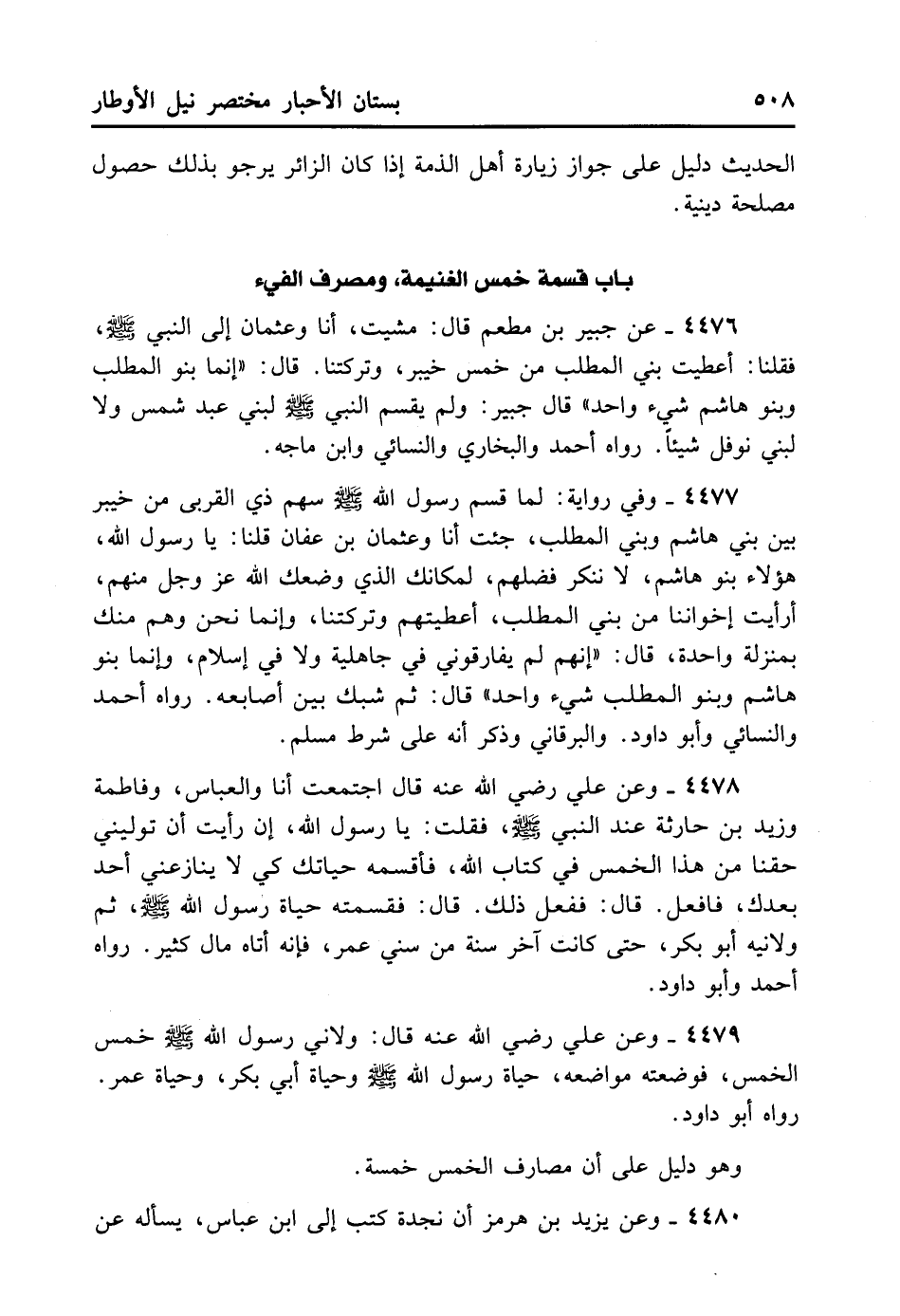 4478- وَعَنْ عَلِيٍّ - رضي الله عنه - قَالَ: اجْتَمَعْتُ أَنَا وَالْعَبَّاسُ وَفَاطِمَةُ وَزَيْدُ بْنُ حَارِثَةَ عِنْدَ النَّبِيِّ - صلى الله عليه وسلم - فَقُلْتُ: يَا رَسُولَ اللهِ إنْ رَأَيْتَ أَنْ تُوَلِّيَنِي حَقَّنَا مِنْ هَذَا الْخُمُسِ فِي كِتَابِ اللهِ تَعَالَى فَأَقْسِمَهُ فِي حَيَاتِكَ كَيْ لا يُنَازِعَنِي أَحَدٌ بَعْدَكَ فَافْعَلْ، قَالَ: فَفَعَلَ ذَلِكَ فَقَسَمْتُهُ حَيَاةَ رَسُولِ اللهِ - صلى الله عليه وسلم - ثُمَّ وَلَّانِيهِ أَبُو بَكْرٍ حَتَّى كَانَتْ آخِرُ سَنَةٍ مِنْ سِنِي عُمَرَ، فَإِنَّهُ أَتَاهُ مَالٌ كَثِيرٌ رَوَاهُ أَحْمَدُ وَأَبُو دَاوُد.