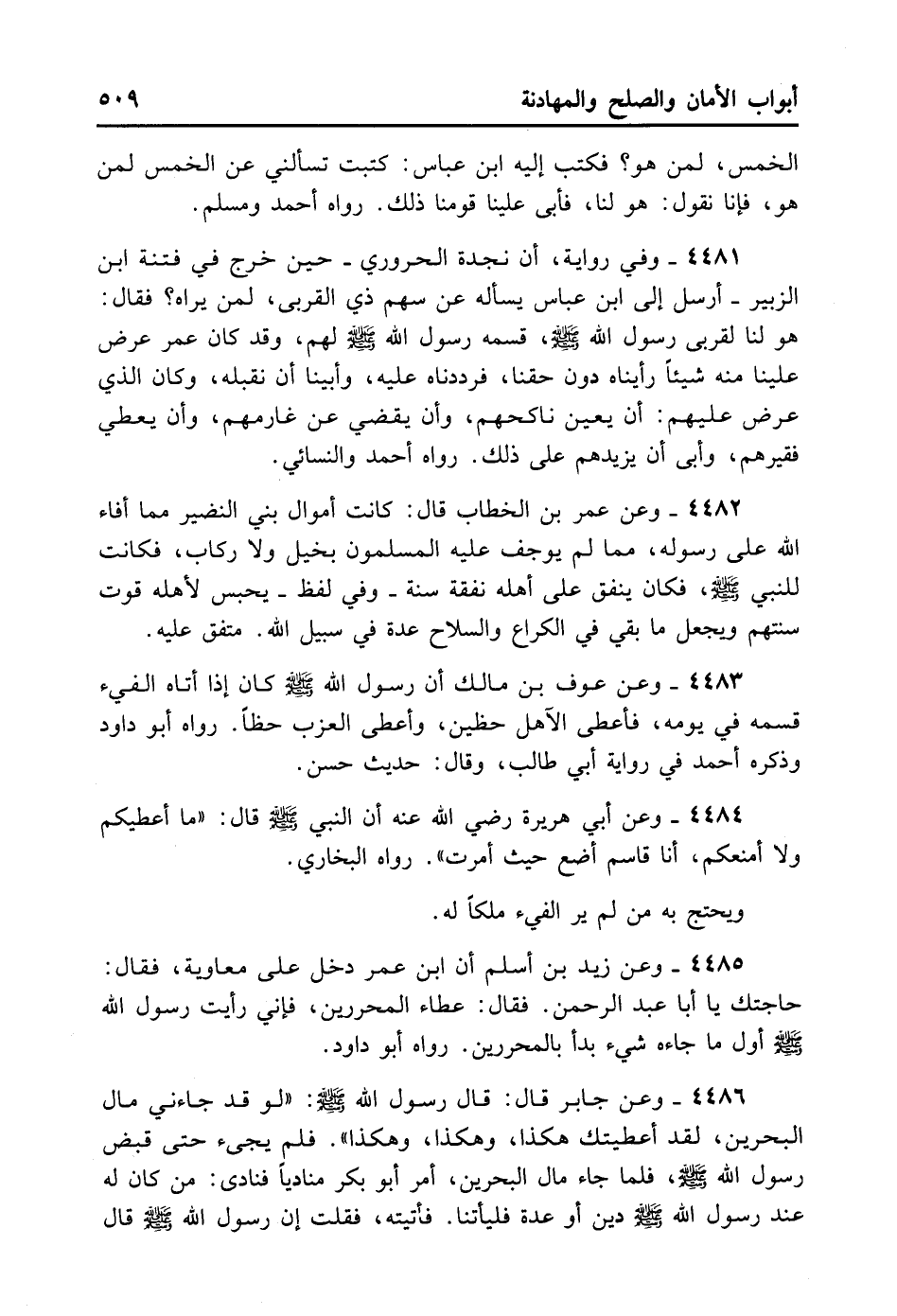 4483- وَعَنْ عَوْفِ بْنِ مَالِكٍ: أَنَّ رَسُولَ اللَّه - صلى الله عليه وسلم - كَانَ إذَا أَتَاهُ الْفَيْءُ قَسَمَهُ فِي يَوْمِهِ، فَأَعْطَى الآهِلَ حَظَّيْنِ، وَأَعْطَى الْعَزَبَ حَظًّا. رَوَاهُ أَبُو دَاوُد وَذَكَرَهُ أَحْمَدُ فِي رِوَايَةِ أَبِي طَالِبٍ وَقَالَ: حَدِيثٌ حَسَنٌ.