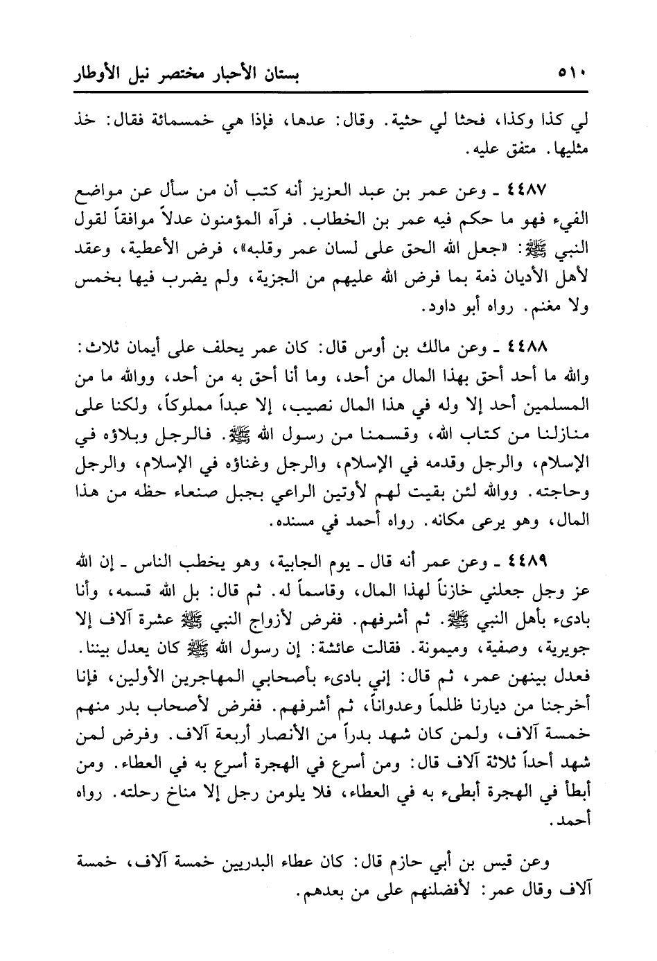 4488- وَعَنْ مَالِكِ بْنِ أَوْسٍ قَالَ: كَانَ عُمَرُ يَحْلِفُ عَلَى أَيْمَانٍ ثَلاثٍ: وَاَللَّهِ مَا أَحَدٌ أَحَقُّ بِهَذَا الْمَالِ مِنْ أَحَدٍ، وَمَا أَنَا أَحَقُّ بِهِ مِنْ أَحَدٍ، وَوَاللهِ مَا مِنْ الْمُسْلِمِينَ أَحَدٌ إِلا وَلَهُ فِي هَذَا الْمَالِ نَصِيبٌ إِلا عَبْدًا مَمْلُوكًا، وَلَكِنَّا عَلَى مَنَازِلِنَا مِنْ كِتَابِ اللهِ، وَقَسْمِنَا مِنْ رَسُولِ اللهِ - صلى الله عليه وسلم - فَالرَّجُلُ وَبَلاؤُهُ فِي الإِسْلامِ، وَالرَّجُلُ وَقِدَمُهُ فِي الإِسْلامِ، وَالرَّجُلُ وَغَنَاؤُهُ فِي الإِسْلامِ، وَالرَّجُلُ وَحَاجَتُهُ، وَوَاللهِ لَئِنْ بَقِيتُ لَهُمْ لأُوتَيَنَّ الرَّاعِيَ بِجَبَلِ صَنْعَاءَ حَظَّهُ مِنْ هَذَا الْمَالِ وَهُوَ يَرْعَى مَكَانَهُ. رَوَاهُ أَحْمَدُ فِي مُسْنَدِهِ.
