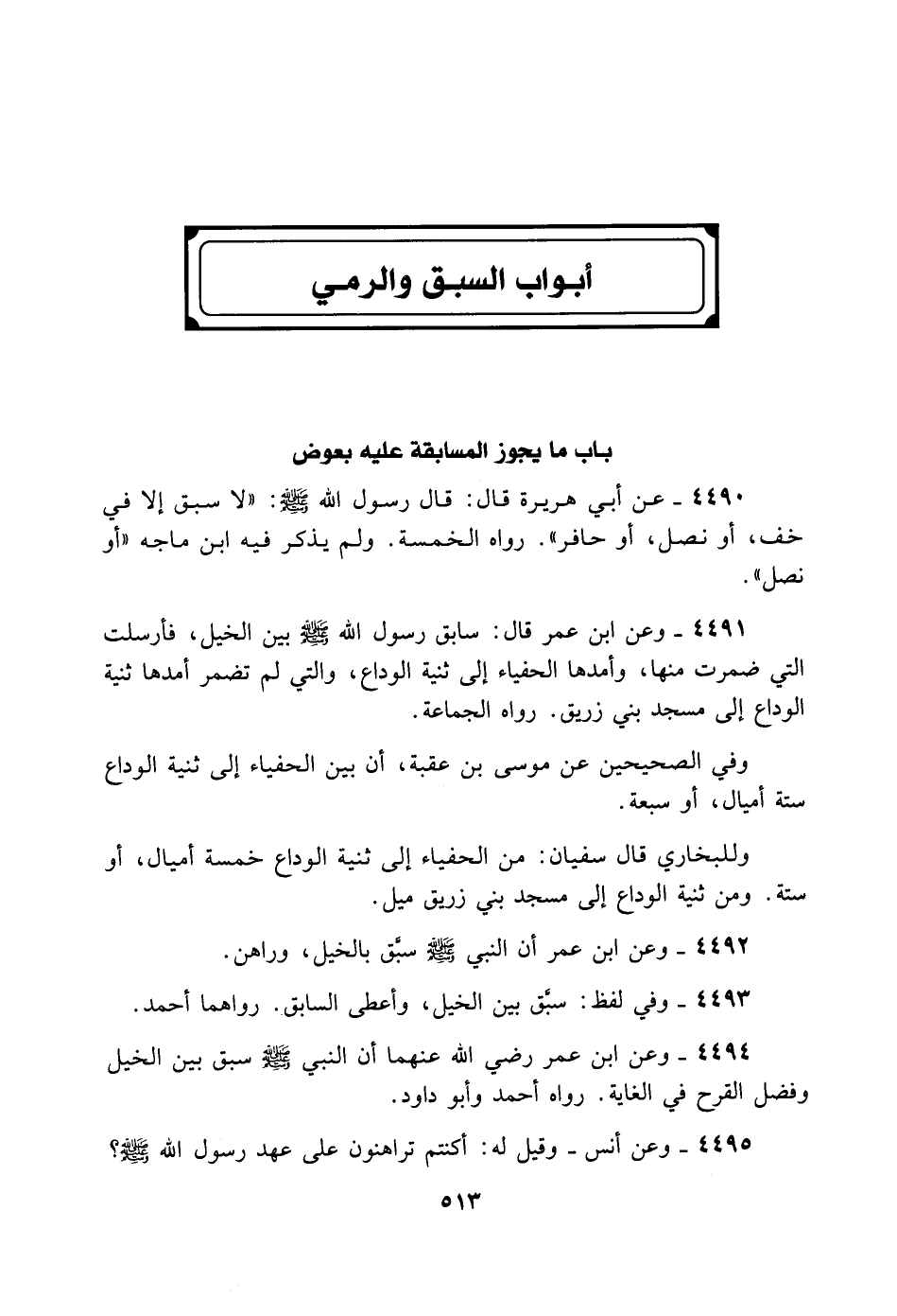 4490- عَنْ أَبِي هُرَيْرَةَ قَالَ: قَالَ رَسُولُ اللهِ - صلى الله عليه وسلم -: «لا سَبَقَ إِلا فِي خُفٍّ أَوْ نَصْلٍ أَوْ حَافِرٍ» . رَوَاهُ الْخَمْسَةُ، وَلَمْ يَذْكُرْ فِيهِ ابْنُ مَاجَةْ «أَوْ نَصْلٍ» .