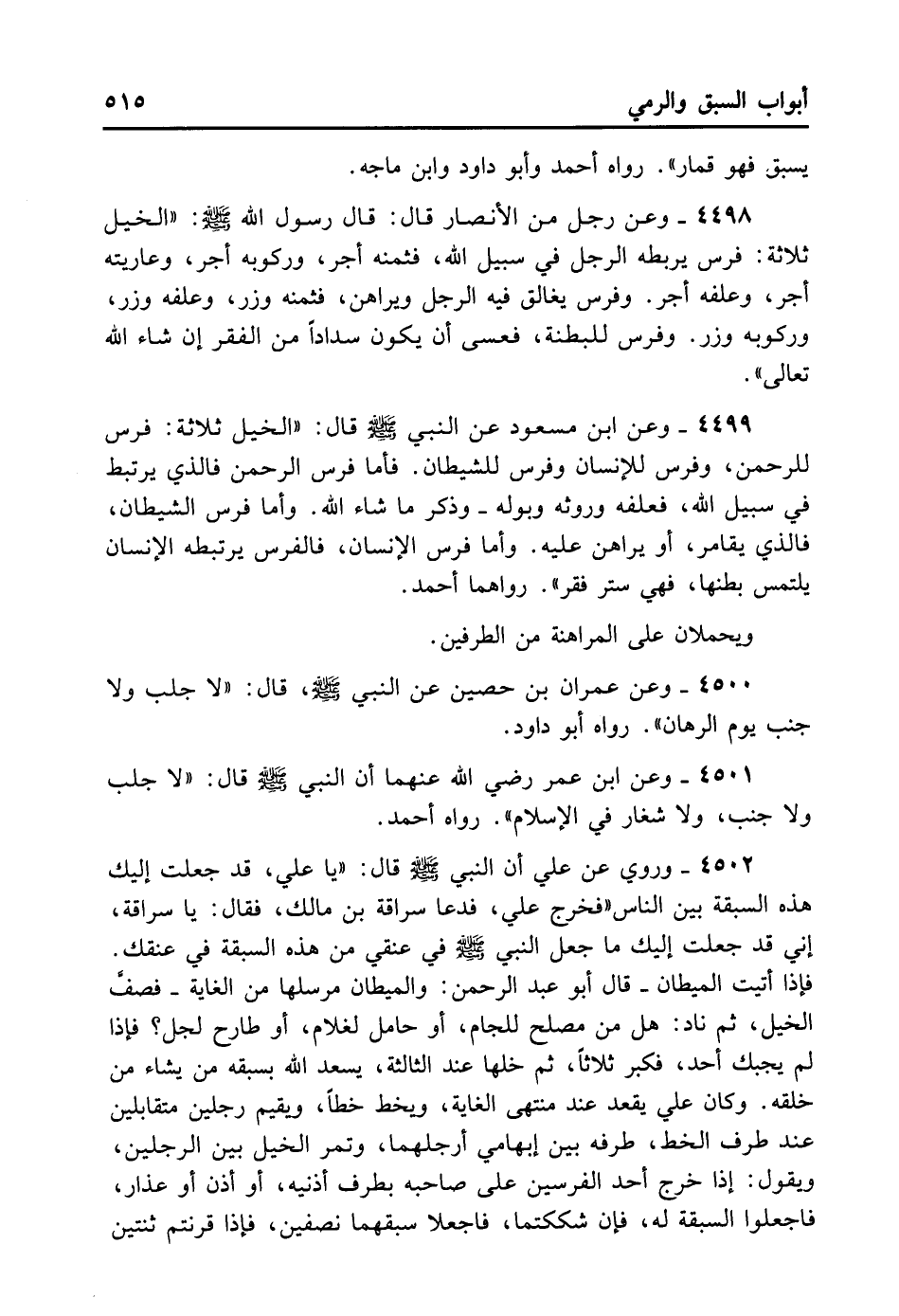 4499- وَعَنْ ابْنِ مَسْعُودٍ عَنْ النَّبِيِّ - صلى الله عليه وسلم - قَالَ: «الْخَيْلُ ثَلاثَةٌ: فَرَسٌ لِلرَّحْمَنِ، وَفَرَسٌ لِلإِنْسَانِ، وَفَرَسٌ لِلشَّيْطَانِ، فَأَمَّا فَرَسُ الرَّحْمَنِ فَاَلَّذِي يَرْتَبِطُ فِي سَبِيلِ اللهِ فَعَلَفُهُ وَرَوْثُهُ وَبَوْلُهُ وَذَكَرَ مَا شَاءَ اللهُ، وَأَمَّا فَرَسُ الشَّيْطَانِ فَاَلَّذِي يُقَامِرُ، أَوْ يُرَاهِنُ عَلَيْهِ، وَأَمَّا فَرَسُ الإِنْسَانِ فَالْفَرَسُ يَرْتَبِطُهُ الإِنْسَانُ يَلْتَمِسُ بَطْنَهَا فَهِيَ سِتْرُ فَقْرٍ» . رَوَاهُمَا أَحْمَدُ.