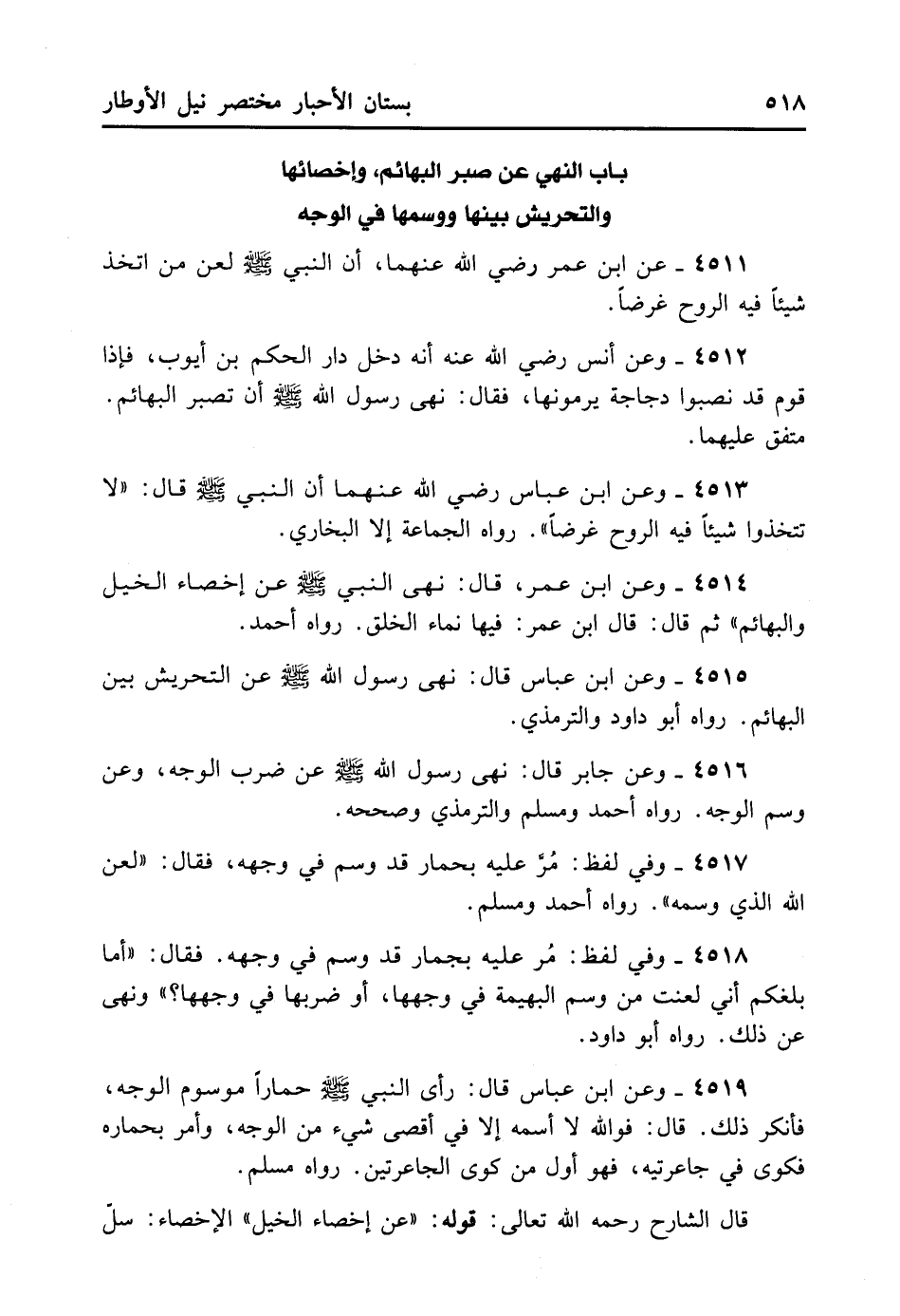 4513- وَعَنْ ابْنِ عَبَّاسٍ رَضِيَ اللهُ عَنْهُمَا أَنَّ النَّبِيَّ - صلى الله عليه وسلم - قَالَ: «لا تَتَّخِذُوا شَيْئًا فِيهِ الرُّوحُ غَرَضًا» . رَوَاهُ الْجَمَاعَةُ إِلا الْبُخَارِيَّ.