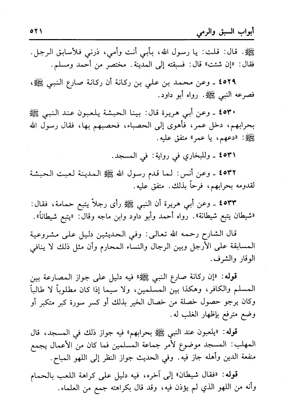 قَالَ الشَّارِحُ رَحِمَهُ اللهُ تَعَالَى قَوْلُهُ: (أَنَّ رُكَانَةُ صَارَعَ النَّبِيَّ - صلى الله عليه وسلم -) فِيهِ دَلِيلٌ عَلَى جَوَازِ الْمُصَارَعَةِ بَيْنَ الْمُسْلِمِ وَالْكَافِرِ وَهَكَذَا بَيْنَ الْمُسْلِمِينَ، وَلاسِيَّمَا إذَا كَانَ مَطْلُوبًا لا طَالِبًا، وَكَانَ يَرْجُو حُصُولَ خَصْلَةٍ مِنْ خِصَالِ الْخَيْرِ بِذَلِكَ أَوْ كَسْرَ سُورَةِ كِبْرِ مُتَكَبِّرٍ أَوْ وَضْعَ مُتَرَفِّعٍ بِإِظْهَارِ الْغَلَبِ لَهُ.