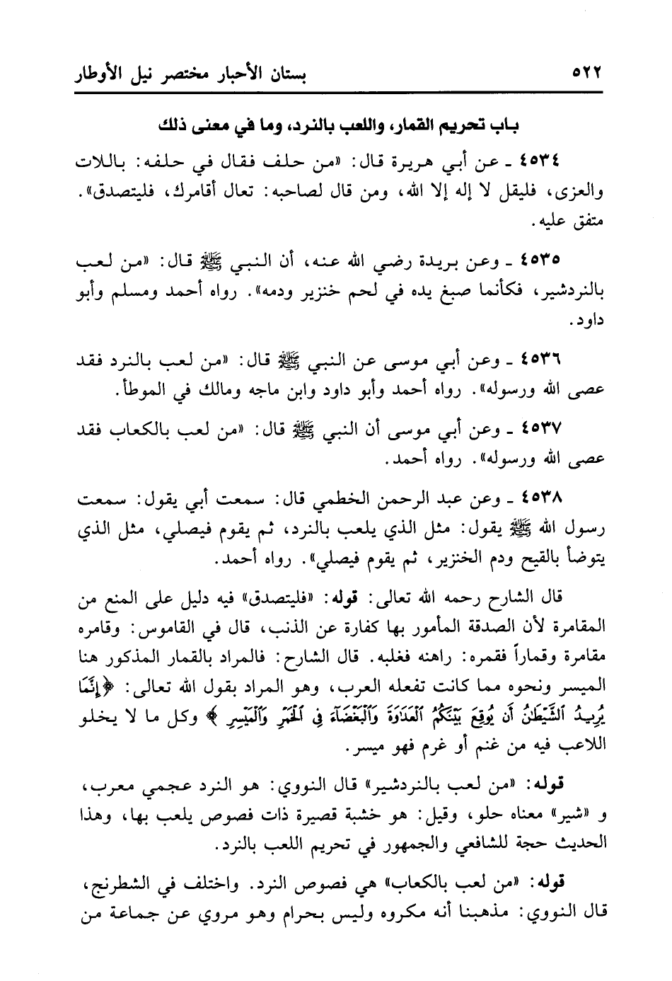 4535- وَعَنْ بُرَيْدَةَ - رضي الله عنه - أَنَّ النَّبِيَّ - صلى الله عليه وسلم - قَالَ: «مَنْ لَعِبَ بِالنَّرْدَشِيرِ فَكَأَنَّمَا صَبَغَ يَدَهُ فِي لَحْمِ خِنْزِيرٍ وَدَمِهِ» . رَوَاهُ أَحْمَدُ وَمُسْلِمٌ وَأَبُو دَاوُد.