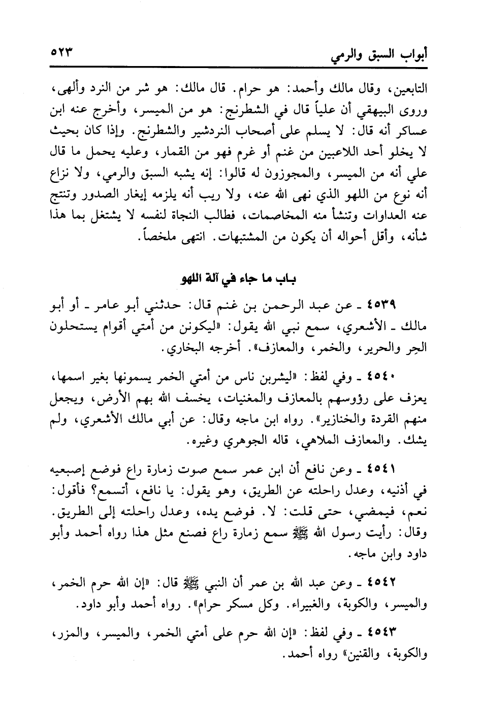 4539- عَنْ عَبْدِ الرَّحْمَنِ بْنِ غُنْمٍ قَالَ: حَدَّثَنِي أَبُو عَامِرٍ - أَوْ أَبُو مَالِكٍ - الأشْعَرِيُّ سَمِعَ نبِيّ الله - صلى الله عليه وسلم - يَقُولُ: «لَيَكُونَنَّ مِنْ أُمَّتِي قَوْمٌ يَسْتَحِلُّونَ الْحِرَ وَالْحَرِيرَ وَالْخَمْرَ وَالْمَعَازِفَ» . أَخْرَجَهُ الْبُخَارِيُّ.