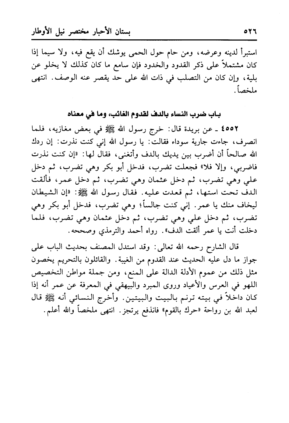4552- عَنْ بُرَيْدَةَ قَالَ: خَرَجَ رَسُولُ اللهِ - صلى الله عليه وسلم - فِي بَعْضِ مَغَازِيهِ فَلَمَّا انْصَرَفَ جَاءَتْ جَارِيَةٌ سَوْدَاءُ فَقَالَتْ: يَا رَسُولَ اللهِ إنِّي كُنْتُ نَذَرْتُ إنْ رَدَّك اللهُ صَالِحًا أَنْ أَضْرِبَ بَيْنِ يَدَيْكَ بِالدُّفِّ وَأَتَغَنَّى فَقَالَ لَهَا: «إنْ كُنْتِ نَذَرْتِ