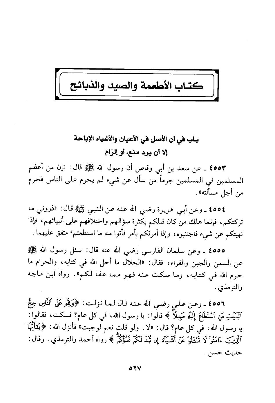 4556- وَعَنْ عَلِيٍّ عَلَيْهِ السَّلامُ قَالَ: لَمَّا نَزَلَتْ {وَلِلَّهِ عَلَى النَّاسِ حِجُّ الْبَيْتِ مَنْ اسْتَطَاعَ إلَيْهِ سَبِيلاً} قَالُوا: يَا رَسُولَ اللهِ فِي كُلِّ عَامٍ؟ فَسَكَتَ فَقَالُوا: يَا رَسُولَ اللهِ فِي كُلِّ عَامٍ؟ قَالَ: «لا. وَلَوْ قُلْتُ نَعَمْ لَوَجَبَتْ» ، فَأَنْزَلَ اللهُ {يَا أَيُّهَا الَّذِينَ آمَنُوا لا تَسْأَلُوا عَنْ أَشْيَاءَ إنْ تُبْدَ لَكُمْ تَسُؤْكُمْ} رَوَاهُ أَحْمَدُ وَالتِّرْمِذِيُّ وَقَالَ: حَدِيثٌ حَسَنٌ.