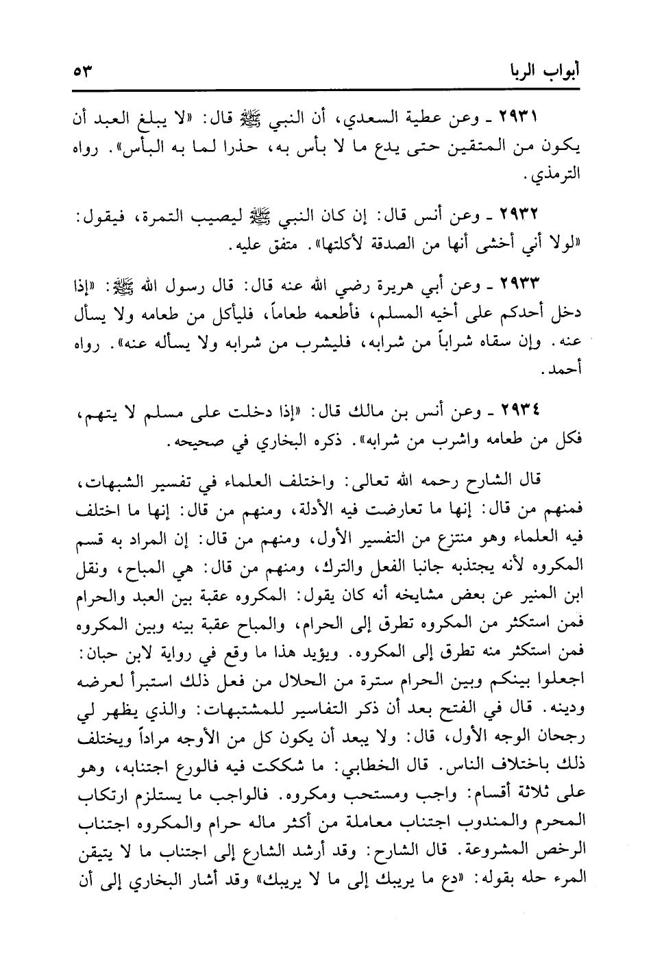 قَالَ الشَّارِحُ رَحِمَهُ اللهُ تَعَالَى: وَاخْتَلَفَ الْعُلَمَاءُ أَيْضًا فِي تَفْسِيرِ الشُّبُهَاتِ فَمِنْهُمْ مَنْ قَالَ: إنَّهَا مَا تَعَارَضَتْ فِيهِ الأَدِلَّةُ وَمِنْهُمْ مَنْ قَالَ: إنَّهَا مَا اخْتَلَفَ فِيهِ الْعُلَمَاءُ وَهُوَ مُنْتَزَعٌ مِنْ التَّفْسِيرِ الأَوَّلِ وَمِنْهُمْ مَنْ قَالَ: إنَّ الْمُرَادَ بِهَا قِسْمُ الْمَكْرُوهِ؛ لأَنَّهُ يَجْتَذِبُهُ جَانِبَا الْفِعْلِ وَالتَّرْكِ، وَمِنْهُمْ مَنْ قَالَ: هِيَ الْمُبَاحُ وَنَقَلَ ابْنُ الْمُنِيرِ عَنْ بَعْضِ مَشَايِخِهِ أَنَّهُ كَانَ يَقُولُ: الْمَكْرُوهُ عَقَبَةٌ بَيْنَ الْعَبْدِ وَالْحَرَامِ، فَمَنْ اسْتَكْثَرَ مِنْ الْمَكْرُوهِ تَطَرَّقَ إلَى الْحَرَامِ، وَالْمُبَاحُ عَقَبَةٌ بَيْنَهُ وَبَيْنَ ... الْمَكْرُوهِ، فَمَنْ اسْتَكْثَرَ مِنْهُ تَطَرَّقَ إلَى الْمَكْرُوهِ وَيُؤَيِّدُ هَذَا مَا وَقَعَ فِي رِوَايَةٍ لابْنِ حِبَّانَ: «اجْعَلُوا بَيْنَكُمْ وَبَيْنَ الْحَرَامِ سُتْرَةً مِنْ الْحَلالِ، مَنْ فَعَلَ ذَلِكَ اسْتَبْرَأَ لِعِرْضِهِ وَدِينِهِ» . قَالَ فِي الْفَتْحِ بَعْدَ أَنْ ذَكَرَ التَّفَاسِيرَ لِلْمُشْتَبِهَاتِ: وَاَلَّذِي يَظْهَرُ لِي رُجْحَانُ الْوَجْهِ الأَوَّلِ، قَالَ: وَلا يَبْعُدُ أَنْ يَكُونَ كُلٌّ مِنْ الأَوْجُهِ مُرَادًا، وَيَخْتَلِفُ ذَلِكَ بِاخْتِلافِ النَّاسِ قَالَ الْخَطَّابِيِّ: مَا شَكَكْتَ فِيهِ فَالْوَرَعُ اجْتِنَابُهُ، وَهُوَ عَلَى ثَلاثَةِ أَقْسَامٍ: وَاجِبٍ، وَمُسْتَحَبٍّ، وَمَكْرُوهٍ فَالْوَاجِبُ: مَا يَسْتَلْزِمُ ارْتِكَابَ الْمُحَرَّمِ وَالْمَنْدُوبُ اجْتِنَابُ مُعَامَلَةِ مَنْ أَكْثَرُ مَالِهِ حَرَامٌ، وَالْمَكْرُوهُ: اجْتِنَابُ الرُّخَصِ الْمَشْرُوعَةِ قَالَ الشَّارِحُ: وَقَدْ أَرْشَدَ الشَّارِعُ إلَى اجْتِنَابِ مَا لا يَتَيَقَّنُ الْمَرْءُ حِلَّهُ بِقَوْلِهِ: «دَعْ مَا يَرِيبُكَ إلَى مَا لا