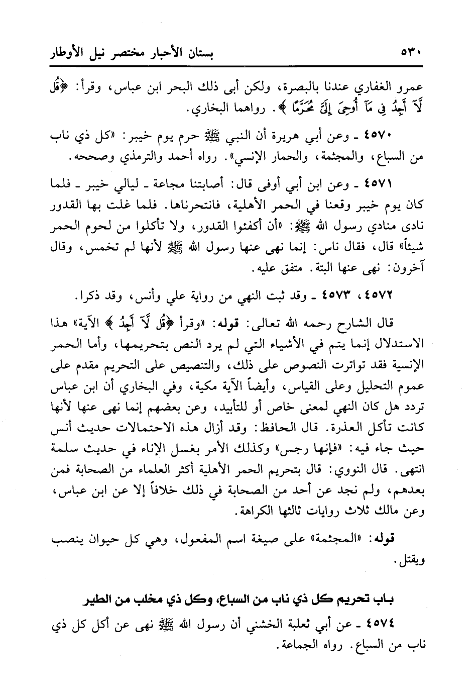 4574- عَنْ أَبِي ثَعْلَبَةَ الْخُشَنِيُّ أَنَّ رَسُولَ اللهِ - صلى الله عليه وسلم - نهي عَنْ أكل كُلُّ ذِي نَابٍ مِنْ السِّبَاعِ. رَوَاهُ الْجَمَاعَةُ.