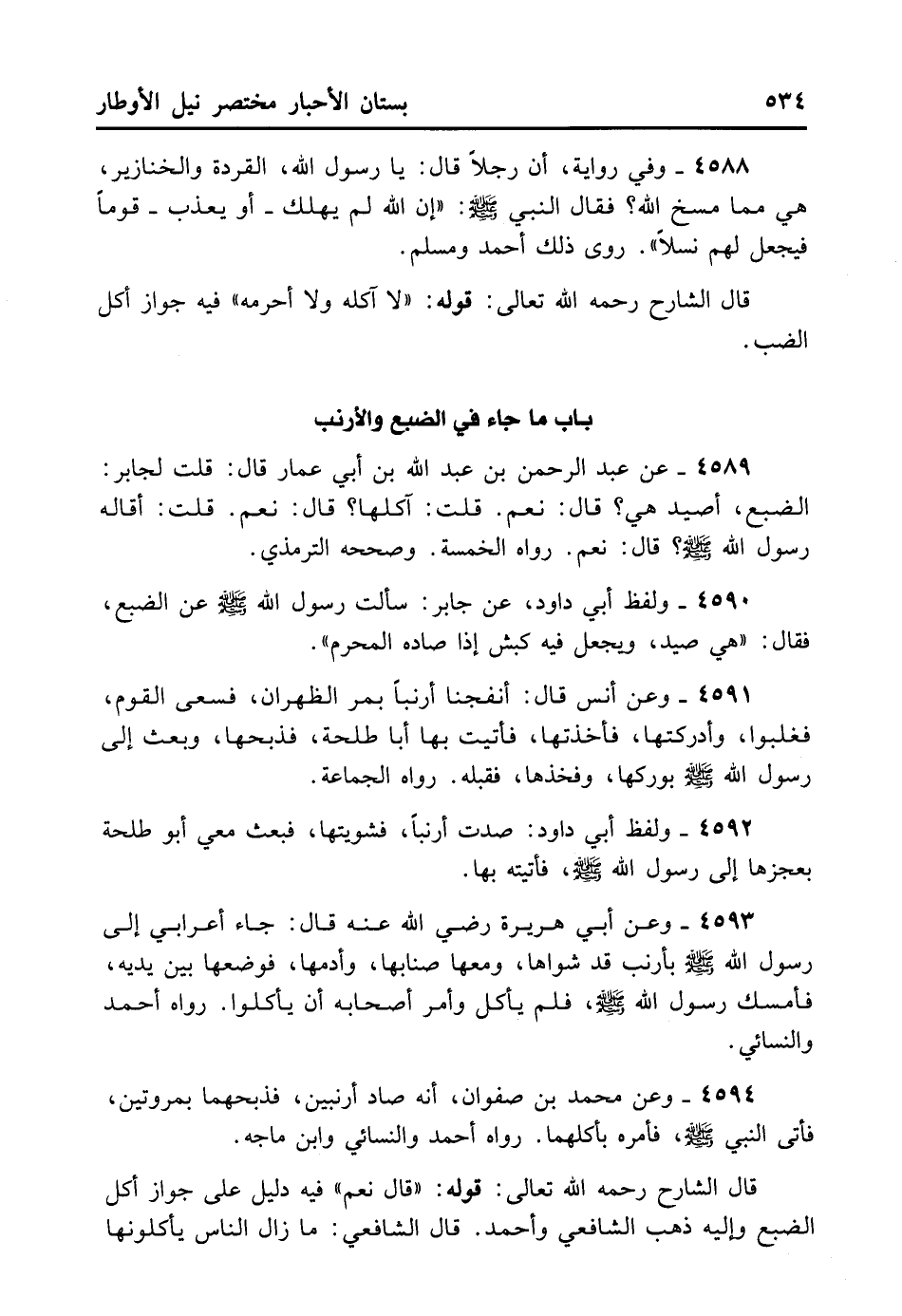 4589- عَنْ عَبْدِ الرَّحْمَنِ بْنِ عَبْدِ اللهِ بْنِ أَبِي عُمَارَةَ قَالَ: قَلْتُ لِجَابِرٍ: الضَّبُعُ أَصَيْدٌ هِيَ؟ قَالَ: نَعَمْ، قُلْتُ: آكُلُهَا؟ قَالَ: نَعَمْ، قُلْتُ: أَقَالَهُ رَسُولُ اللهِ - صلى الله عليه وسلم -؟ قَالَ: نَعَمْ. رَوَاهُ الْخَمْسَةُ وَصَحَّحَهُ التِّرْمِذِيُّ.