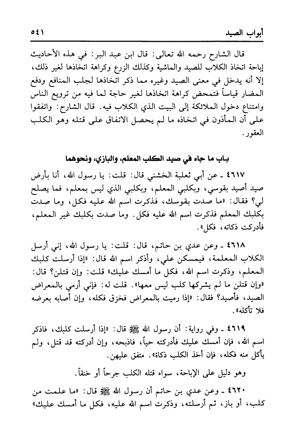 قَالَ الشَّارِحُ رَحِمَهُ اللهُ تَعَالَى: قَالَ ابْنُ عَبْدِ الْبَرِّ: فِي هَذِهِ الأحَادِيثِ إبَاحَةُ اتِّخَاذِ الْكَلْبِ لِلصَّيْدِ وَالْمَاشِيَةِ وَكَذَلِكَ لِلزَّرْعِ وَكَرَاهَةُ اتِّخَاذِهَا لِغَيْرِ ذَلِكَ إِلا أَنَّهُ يَدْخُلُ فِي مَعْنَى الصَّيْدِ وَغَيْرِهِ مِمَّا ذُكِرَ اتِّخَاذُهَا لِجَلْبِ الْمَنَافِعِ وَدَفْعِ الْمَضَارِّ قِيَاسًا فَتَمْحَضُ كَرَاهَةُ اتِّخَاذِهَا لِغَيْرِ حَاجَةٍ لِمَا فِيهِ مِنْ تَرْوِيعِ النَّاسِ وَامْتِنَاعِ