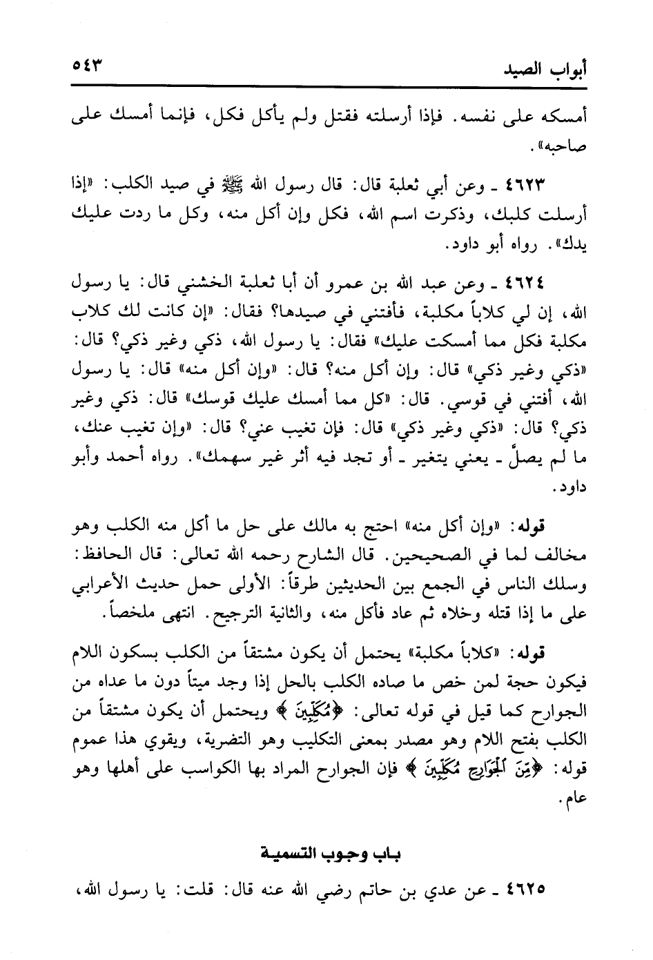 4624- وَعَنْ عَبْدِ اللهِ بْنِ عَمْرٍو أَنَّ أَبَا ثَعْلَبَةَ الْخُشَنِيُّ قَالَ: يَا رَسُولَ اللهِ إنَّ لِي كِلابًا مُكَلَّبَةً فَأَفْتِنِي فِي صَيْدِهَا، قَالَ: «إنْ كَانَتْ لَك كِلابٌ مُكَلَّبَةٌ فَكُلْ مِمَّا أَمْسَكَتْ عَلَيْك» . فَقَالَ: يَا رَسُولَ اللهِ ذَكِيٌّ وَغَيْرُ ذَكِيٍّ؟ قَالَ: «ذَكِيٌّ وَغَيْرُ ذَكِيٍّ» . قَالَ: وَإِنْ أَكَلَ مِنْهُ؟ قَالَ: «وَإِنْ أَكَلَ مِنْهُ» . قَالَ: يَا رَسُولَ اللهِ أَفْتِنِي فِي قَوْسِي، قَالَ: «كُلْ مِمَّا أَمْسَكَ عَلَيْك قَوْسُكَ» . قَالَ ذَكِيٌّ وَغَيْرُ ذَكِيٍّ؟ قَالَ: «ذَكِيٌّ وَغَيْرُ ذَكِيٍّ» . قَالَ: فَإِنْ تَغَيَّبَ عَنِّي؟ قَالَ: «وَإِنْ تَغَيَّبَ عَنْك مَا لَمْ يَصِلَّ - يَعْنِي يَتَغَيَّرْ - أَوْ تَجِدْ فِيهِ أَثَرَ غَيْرِ سَهْمِكَ» . رَوَاهُ أَحْمَدُ وَأَبُو دَاوُد.