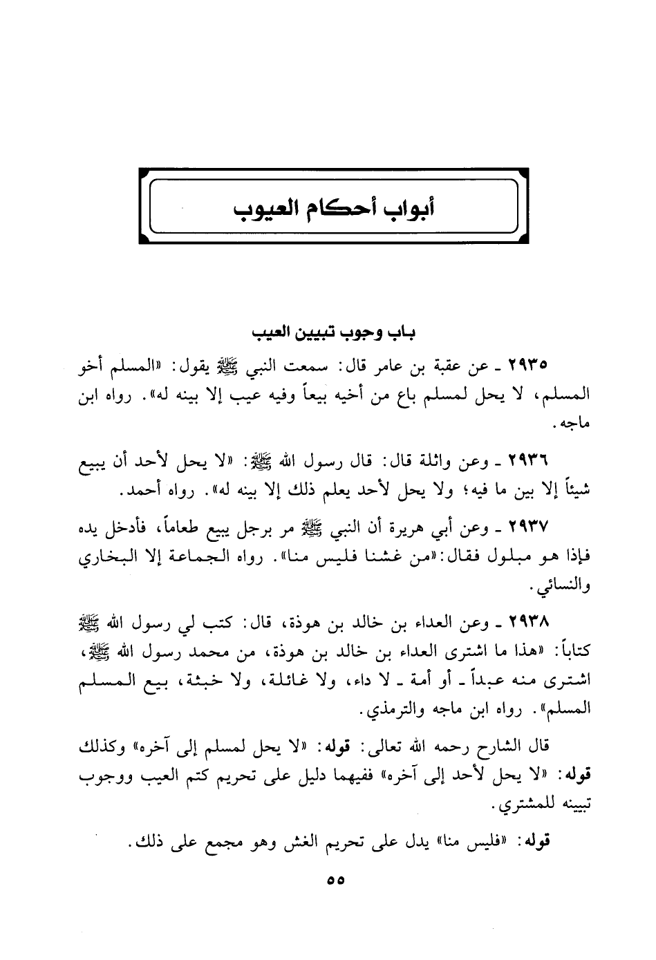 قَالَ الشَّارِحُ رَحِمَهُ اللهُ تَعَالَى: قَوْلُهُ: «لا يَحِلُّ لِمُسْلِمٍ» إلَى آخْره، وَكَذَلِكَ قَوْلُهُ: «لا يَحِلُّ لأَحَدٍ» إلَى آخْره، فِيهِمَا دَلِيلٌ عَلَى تَحْرِيمِ كَتْمِ الْعَيْبِ وَوُجُوبِ تَبْيِينِهِ لِلْمُشْتَرِي.