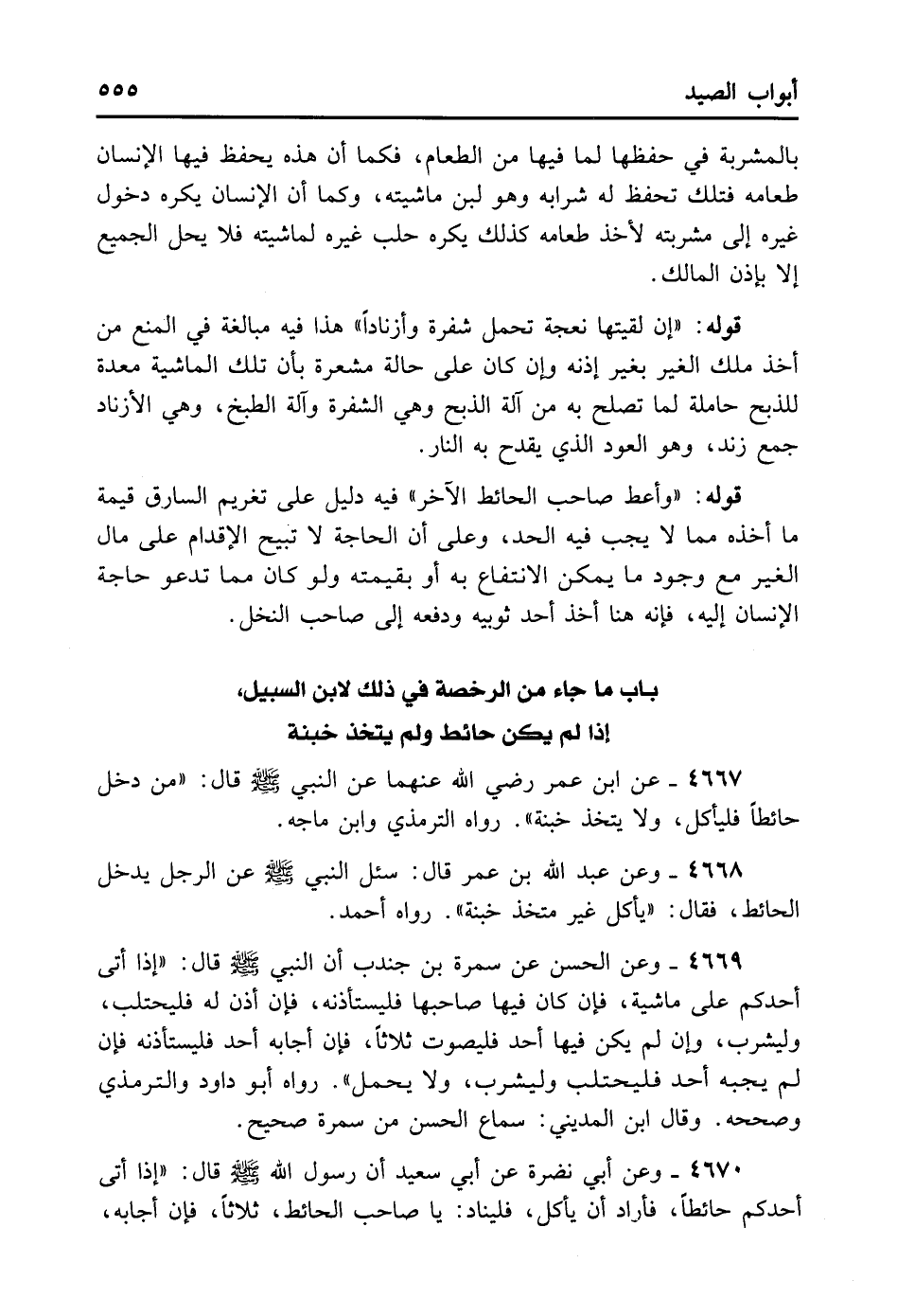 4669- وَعَنْ الْحَسَنِ عَنْ سَمُرَةَ بْنِ جُنْدُبٍ أَنَّ النَّبِيَّ - صلى الله عليه وسلم - قَالَ: «إذَا أَتَى أَحَدُكُمْ عَلَى مَاشِيَةٍ، فَإِنْ كَانَ فِيهَا صَاحِبُهَا فَلْيَسْتَأْذِنْهُ، فَإِنْ أَذِنَ لَهُ فَلْيَحْتَلِبْ وَلْيَشْرَبْ، وَإِنْ لَمْ يَكُنْ فِيهَا أَحَدٌ فَلْيُصَوِّتْ ثَلاثًا، فَإِنْ أَجَابَهُ أَحَدٌ فَلْيَسْتَأْذِنْهُ، فَإِنْ لَمْ يُجِبْهُ أَحَدٌ فَلْيَحْتَلِبْ وَلْيَشْرَبْ وَلا يَحْمِلْ» . رَوَاهُ أَبُو دَاوُد وَالتِّرْمِذِيُّ وَصَحَّحَهُ. وَقَالَ ابْنُ الْمَدِينِيِّ: سَمَاعُ الْحَسَنِ مِنْ سَمُرَةَ صَحِيحٌ.