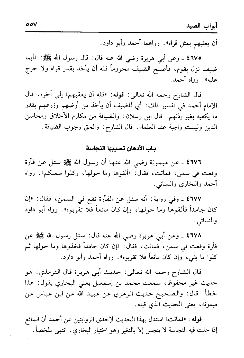 4676- عَنْ مَيْمُونَةَ رَضِيَ اللهُ عَنْهَا: أَنَّ رَسُولَ اللهِ - صلى الله عليه وسلم - سُئِلَ عَنْ فَأْرَةٍ وَقَعَتْ فِي سَمْنٍ فَمَاتَتْ، فَقَالَ: «أَلْقُوهَا وَمَا حَوْلَهَا وَكُلُوا سَمْنَكُمْ» . رَوَاهُ أَحْمَدُ وَالْبُخَارِيُّ وَالنَّسَائِيُّ.