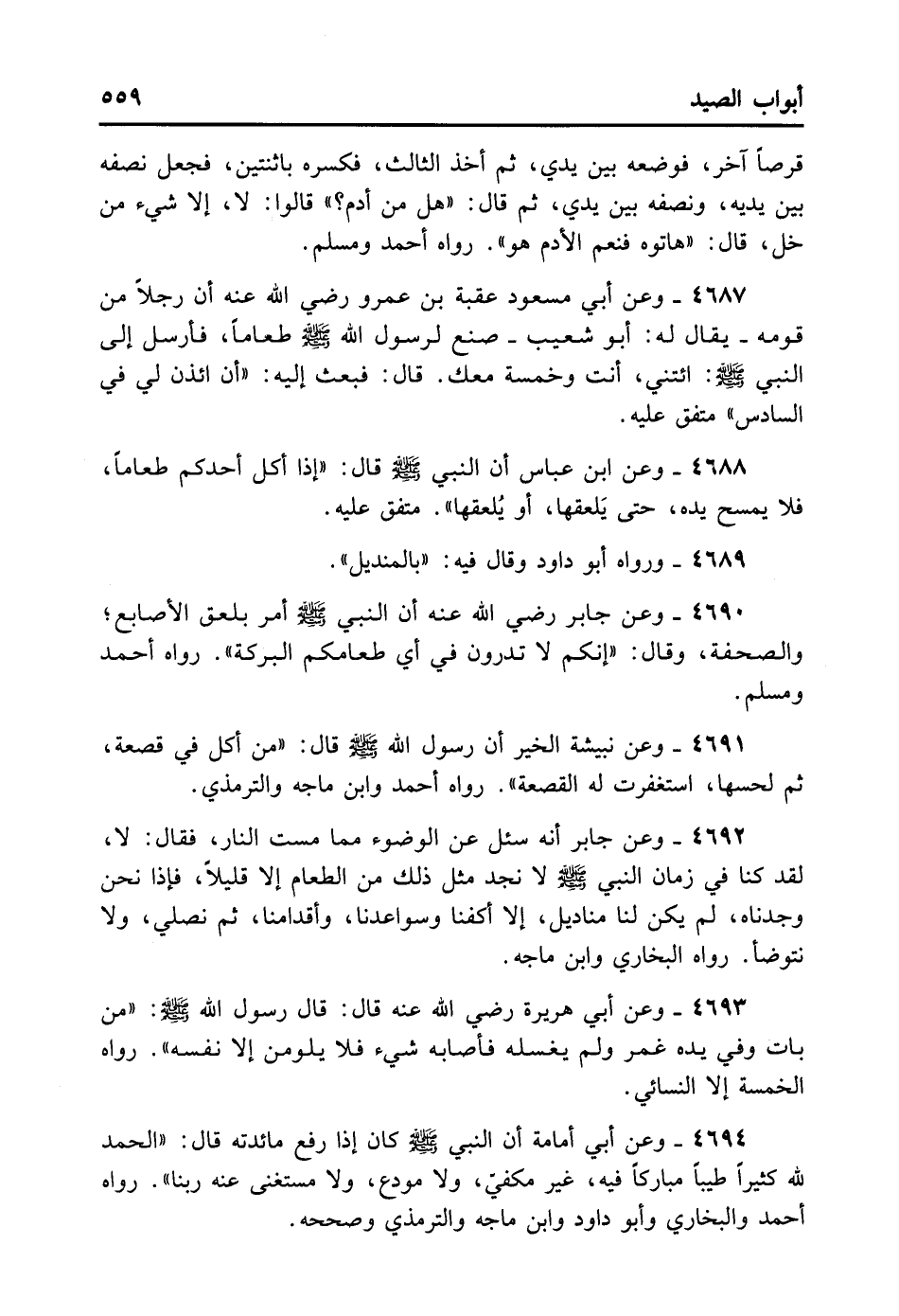 4690- وَعَنْ جَابِرٍ - رضي الله عنه - أَنَّ النَّبِيَّ - صلى الله عليه وسلم - أَمَرَ بِلَعْقِ الأصَابِعِ وَالصَّحْفَةِ، وَقَالَ: «إنَّكُمْ لا تَدْرُونَ فِي أَيِّ طَعَامِكُمْ الْبَرَكَةُ» . رَوَاهُ أَحْمَدُ وَمُسْلِمٌ.