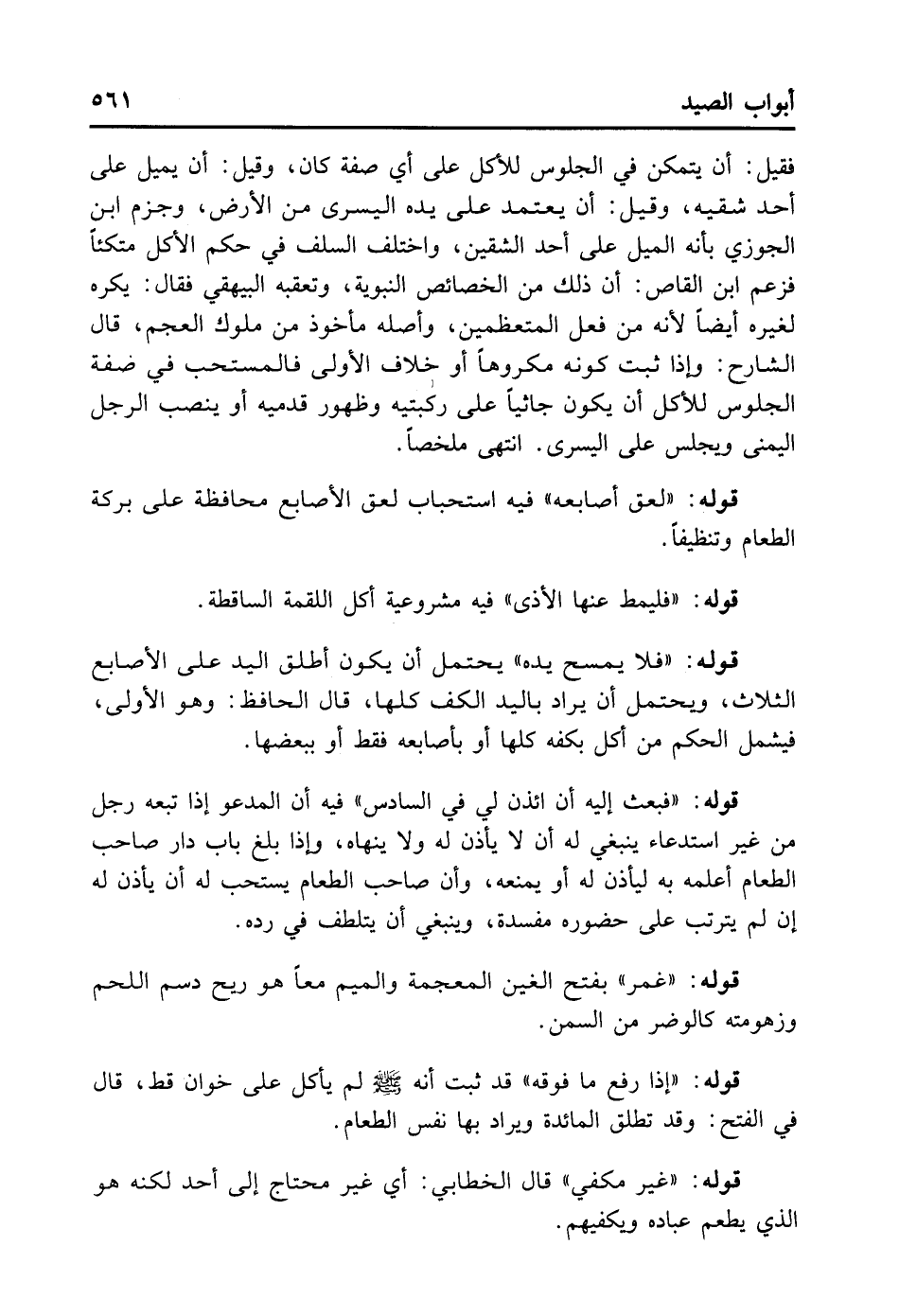 قَوْلُهُ: «فَلا يَمْسَحُ يَدَهُ» يُحْتَمَلُ أَنْ يَكُونَ أَطْلَقَ الْيَدَ عَلَى الأصَابِعِ الثَّلاثِ، وَيُحْتَمَلُ أَنْ يرَادُ بِالْيَدِ الْكَفِّ كُلِّهَا. قَالَ الْحَافِظُ: وَهُوَ الأوْلَى فَيَشْمَلُ الْحُكْمُ مَنْ أَكَلَ بِكَفِّهِ بِكُلِّهَا أَوْ بِأَصَابِعِهِ فَقَطْ أَوْ بِبَعْضِهَا.
