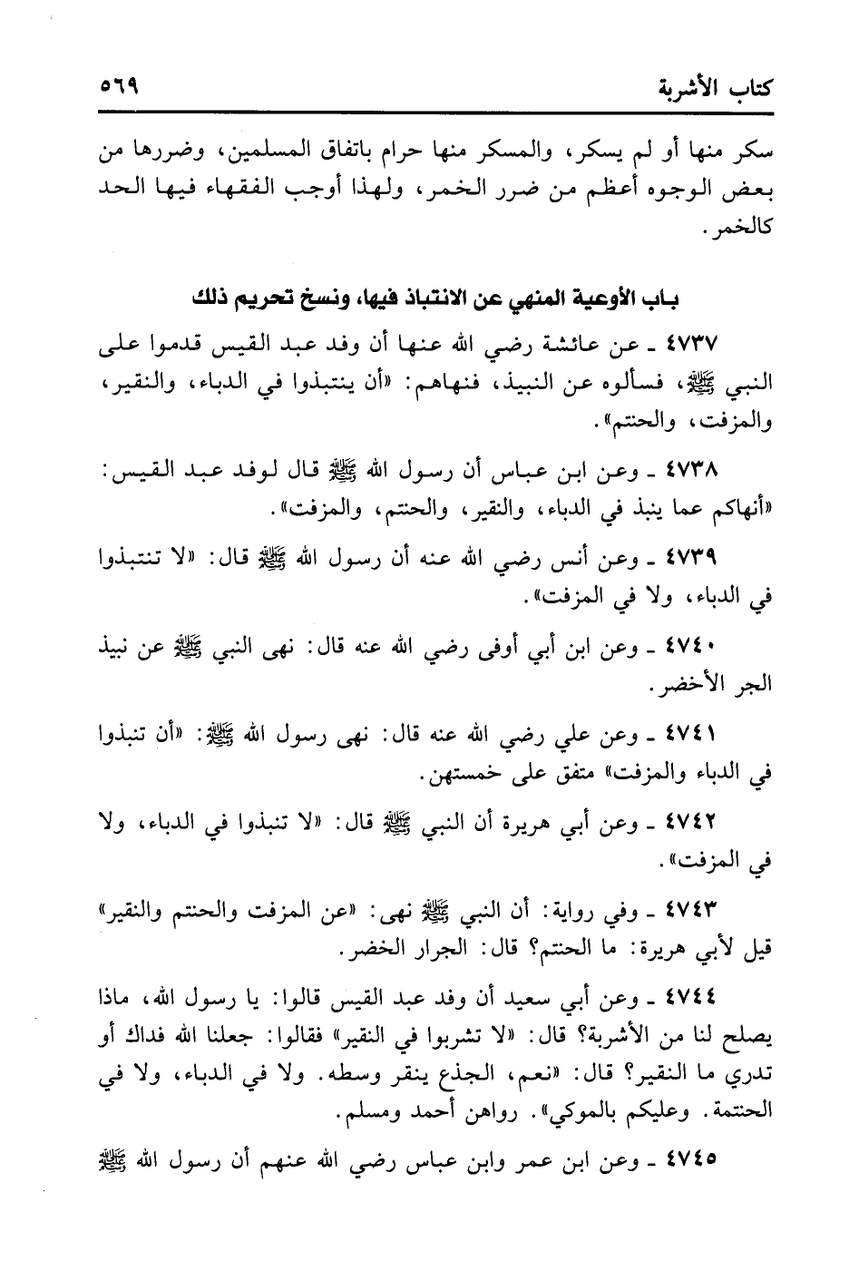 4738- وَعَنْ ابْنِ عَبَّاسٍ أَنَّ رَسُولَ اللهِ - صلى الله عليه وسلم - قَالَ لِوَفْدِ عَبْدِ الْقَيْسِ: ... «أَنْهَاكُمْ عَمَّا يُنْبَذُ فِي الدُّبَّاءِ وَالنَّقِيرِ وَالْحَنْتَمِ وَالْمُزَفَّتِ» .