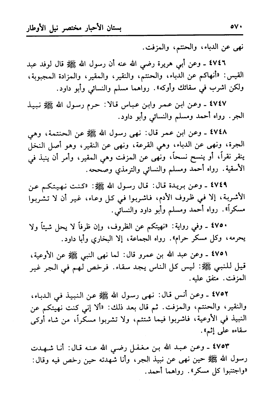 4748- وَعَنْ ابْنِ عُمَرَ قَالَ: نَهَى رَسُولُ اللهِ - صلى الله عليه وسلم - عَنْ الْحَنْتَمَةِ وَهِيَ ... الْجَرَّةُ، وَنَهَى عَنْ الدُّبَّاءِ: وَهِيَ الْقَرْعَةُ، وَنَهَى عَنْ النَّقِيرِ: وَهُوَ أَصْلُ النَّخْلِ يُنْقَرُ نَقْرًا وَيُنْسَخُ نَسْخًا، وَنَهَى عَنْ الْمُزَفَّتِ: وَهُوَ الْمُقَيَّرُ، وَأَمَرَ أَنْ يُنْبَذَ فِي الأسْقِيَةِ. رَوَاهُ أَحْمَدُ وَمُسْلِمٌ وَالنَّسَائِيُّ وَالتِّرْمِذِيُّ وَصَحَّحَهُ.