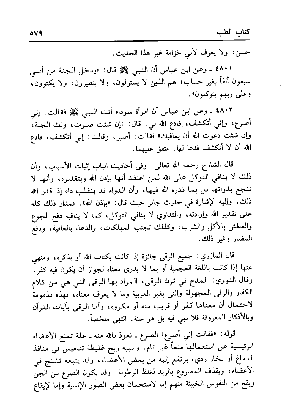 قَالَ الْمَازِرِيُّ: جَمِيعُ الرُّقَى جَائِزَةٌ إذَا كَانَتْ بِكِتَابِ اللهِ أَوْ بِذِكْرِهِ، وَمَنْهِيٌّ عَنْهَا إذَا كَانَتْ بِاللُّغَةِ الْعَجَمِيَّةِ أَوْ بِمَا لا يُدْرَى مَعْنَاهُ لِجَوَازِ أَنْ يَكُونَ فِيهِ كُفْرٌ. قَالَ النَّوَوِيُّ: الْمَدْحُ فِي تَرْكِ الرُّقَى الْمُرَادِ بِهَا الرُّقَى الَّتِي هِيَ مِنْ كَلامِ الْكُفَّارِ، وَالرُّقَى الْمَجْهُولَةِ وَاَلَّتِي بِغَيْرِ الْعَرَبِيَّةِ وَمَا لا يُعْرَفُ مَعْنَاهُ فَهَذِهِ مَذْمُومَةٌ لاحْتِمَالِ أَنَّ مَعْنَاهَا كُفْرٌ أَوْ قَرِيبٌ مِنْهُ أَوْ مَكْرُوهٌ. وَأَمَّا الرُّقَى بِآيَاتِ الْقُرْآنِ وَبِالأذْكَارِ الْمَعْرُوفَةِ فَلا نَهْيَ فِيهِ بَلْ هُوَ سُنَّةٌ. انْتَهَى مُلَخَّصًا.