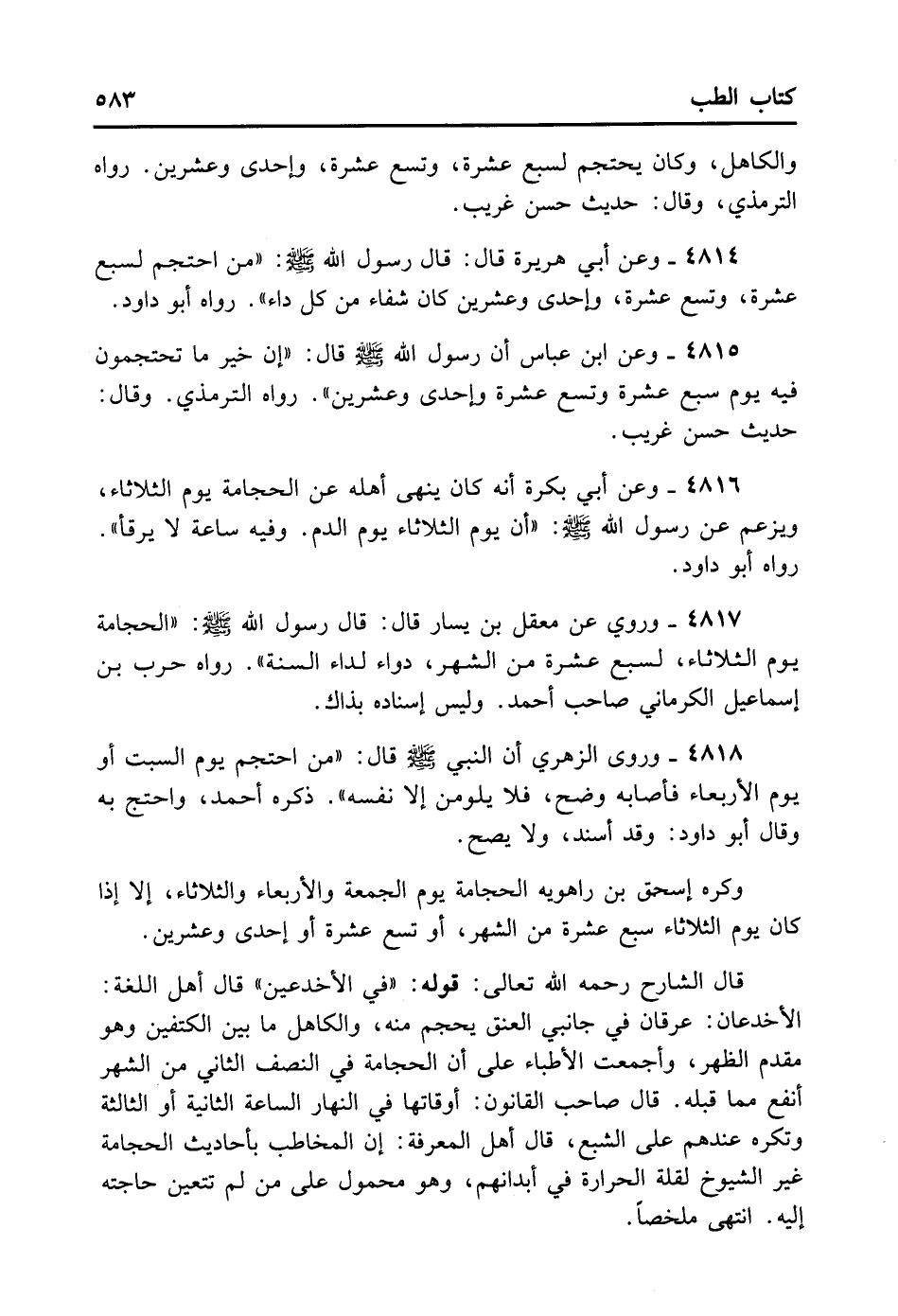 وَالْكَاهِلِ، وَكَانَ يَحْتَجِمُ لِسَبْعَ عَشْرَةَ وَتِسْعَ عَشْرَةَ وَإِحْدَى وَعِشْرِينَ. رَوَاهُ التِّرْمِذِيُّ وَقَالَ: حَدِيثٌ حَسَنٌ غَرِيبٌ.